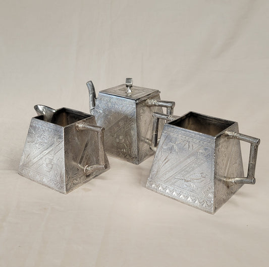 Antique James W. Tufts Boston Engraved Silverplate Aesthetic Movement Tea Set