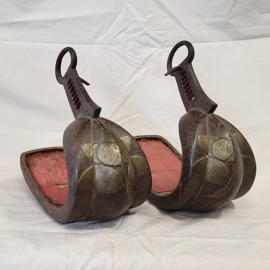 Antique Edo Period Japanese Samurai Iron Stirrups with Brass or Bronze Inlay