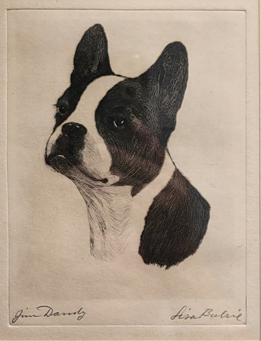 "Jim Dandy" Boston Terrier by Lisa Balsie - etching, early 20th century, USA