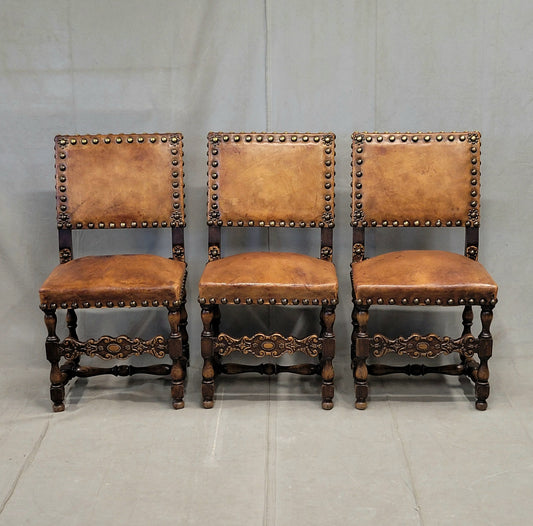 Antique Spanish or Renaissance Revival Oak and Leather Side Chairs - Set of 3