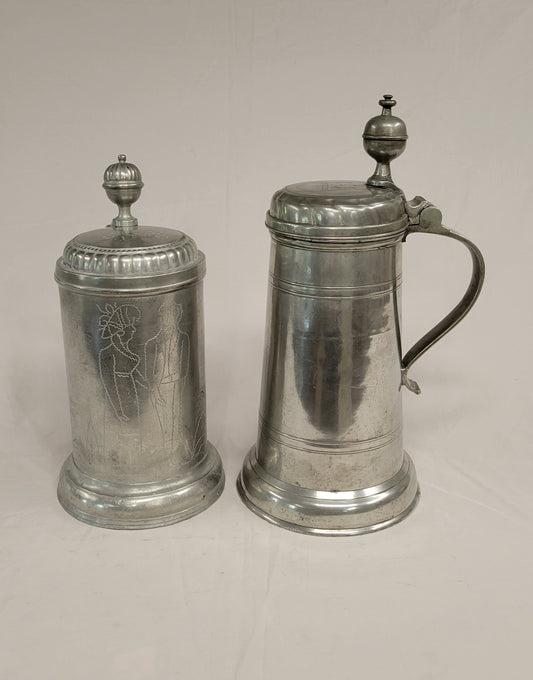 Set of Antique Circa 1800 German Inscribed Pewter Tankards Steins With Illustration and Inscriptions