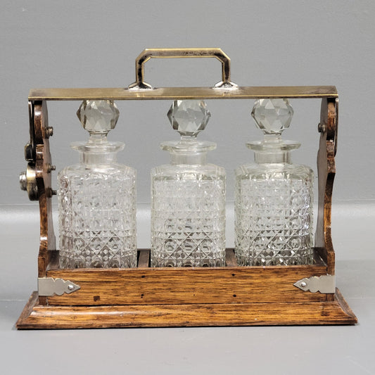 Antique Circa 1900 English Three Bottle Cut Crystal and Oak Tantalus