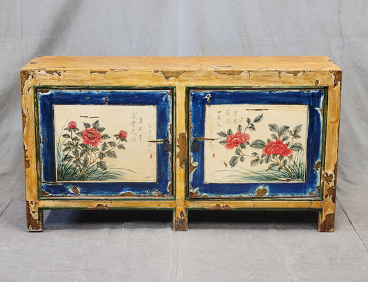 Vintage Chinese Distressed Lacquer Storage Cabinet Console With Floral Motif