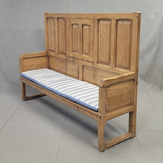 Antique Rustic Pine Long Settle Bench With Blue and White Cushion