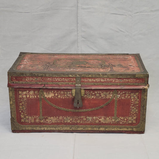 Antique Red Leather, Brass and Camphor Wood Chinese Export Trunk