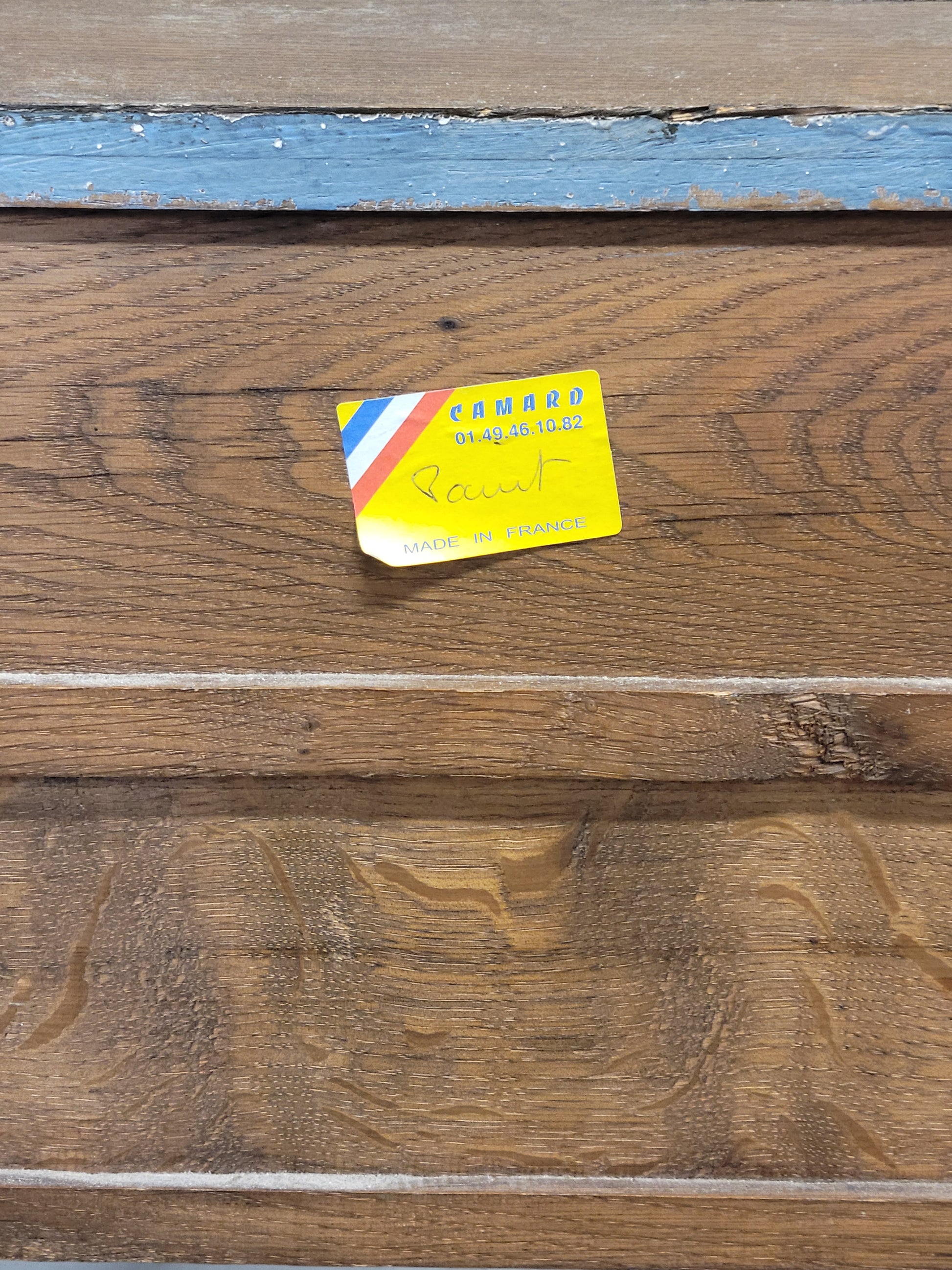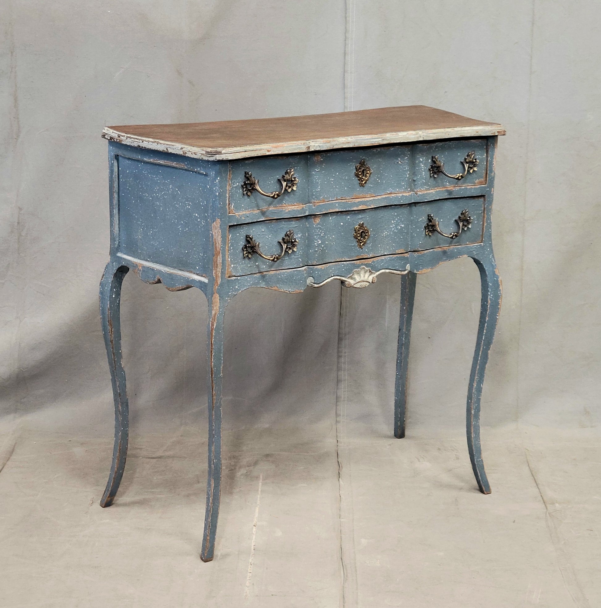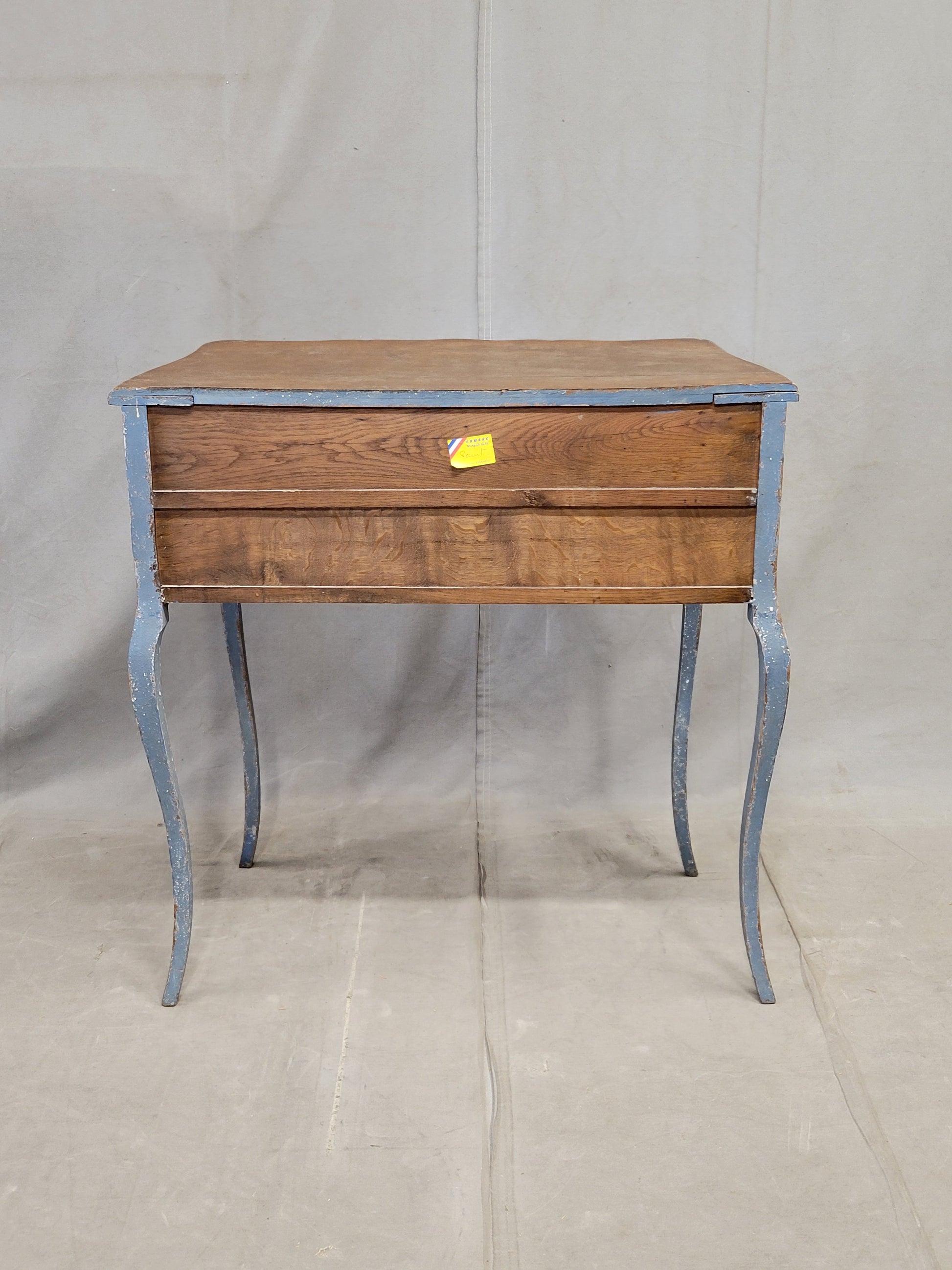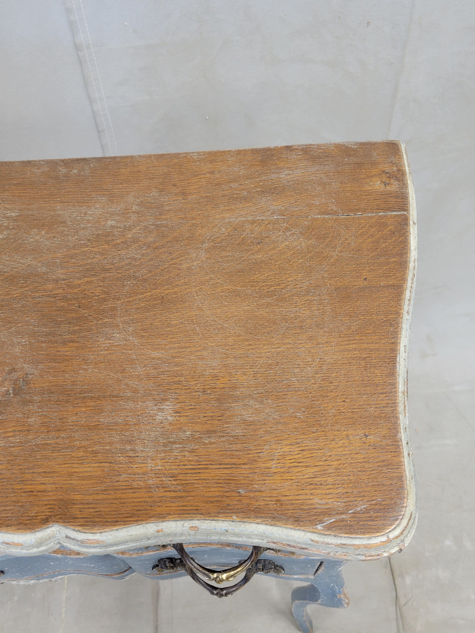 In as found condition. Light flaking of paint. Imperfections in the painted surface from purposeful distressing and use. The legs and cabinet are strong and sturdy. The drawers glide smoothly. Scratches in the natural wood top from use.