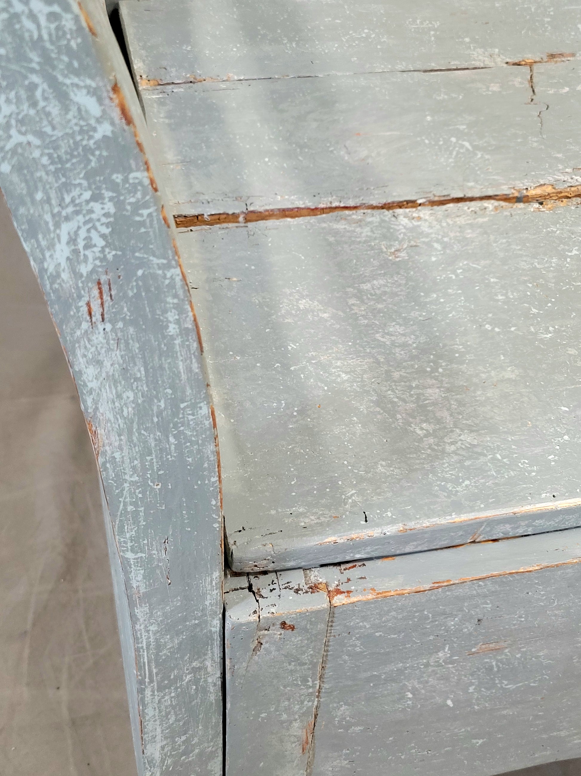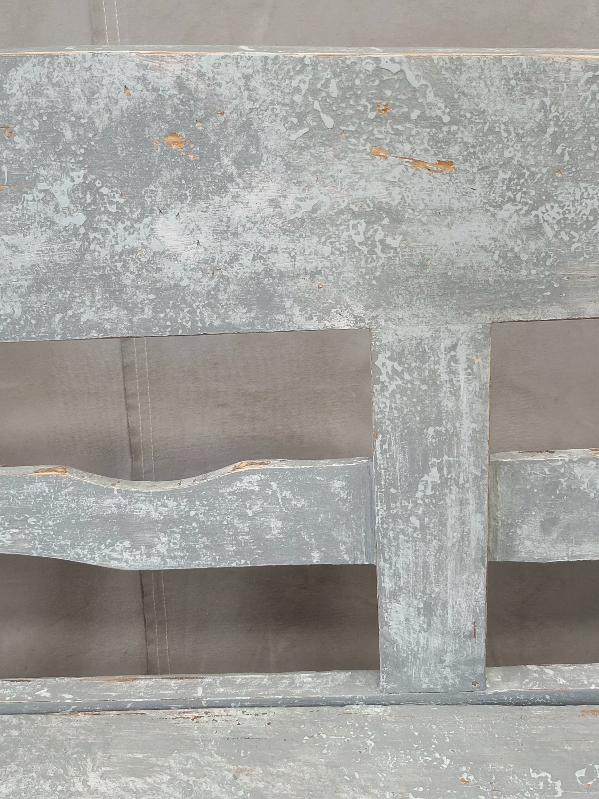 A beautiful antique late 1800s Swedish pine storage bench with distressed blue/gray paint and an optional custom made linen tie on cushion. This bench, also called a kitchen or trundle bench, was used to store bedding. At night the seat would be removed and the insert pulled out to create an extra bed. This bench disassembles easily into three pieces but it is fully functional and sturdy as a storage bench when it is assembled. The Gustavian blue gray paint is recent, but painted in an antique, distressed manner. The wood seat of the bench is strong and distress painted with spaces in between the slats, though it is sturdy. For a rustic look the bench can be used without the custom made linen tie-on cushion. Use the linen cushion for a more formal, finished appearance.