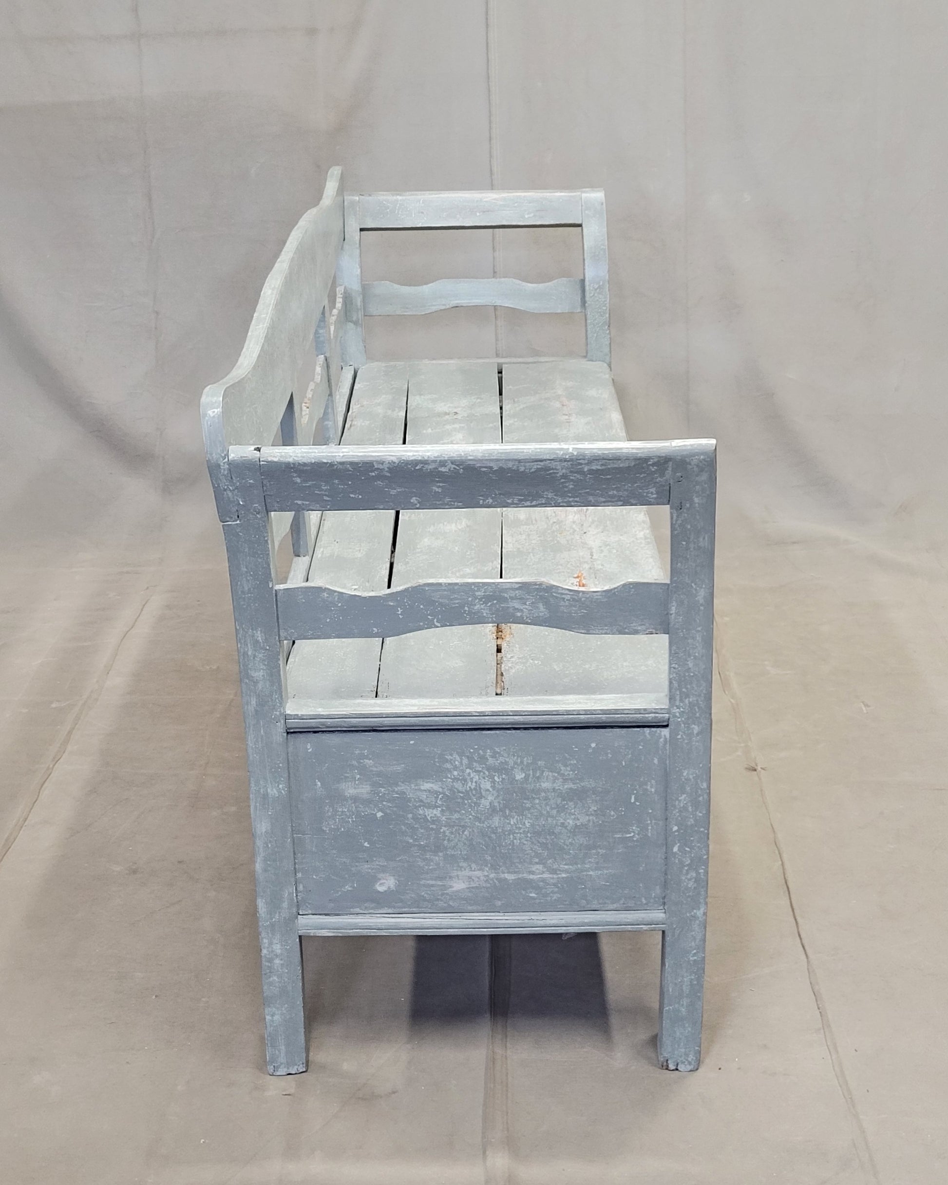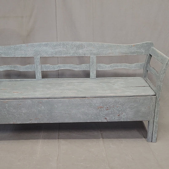 Antique 19th Century Swedish Storage Bench with Blue/Gray Paint and Linen Cushion