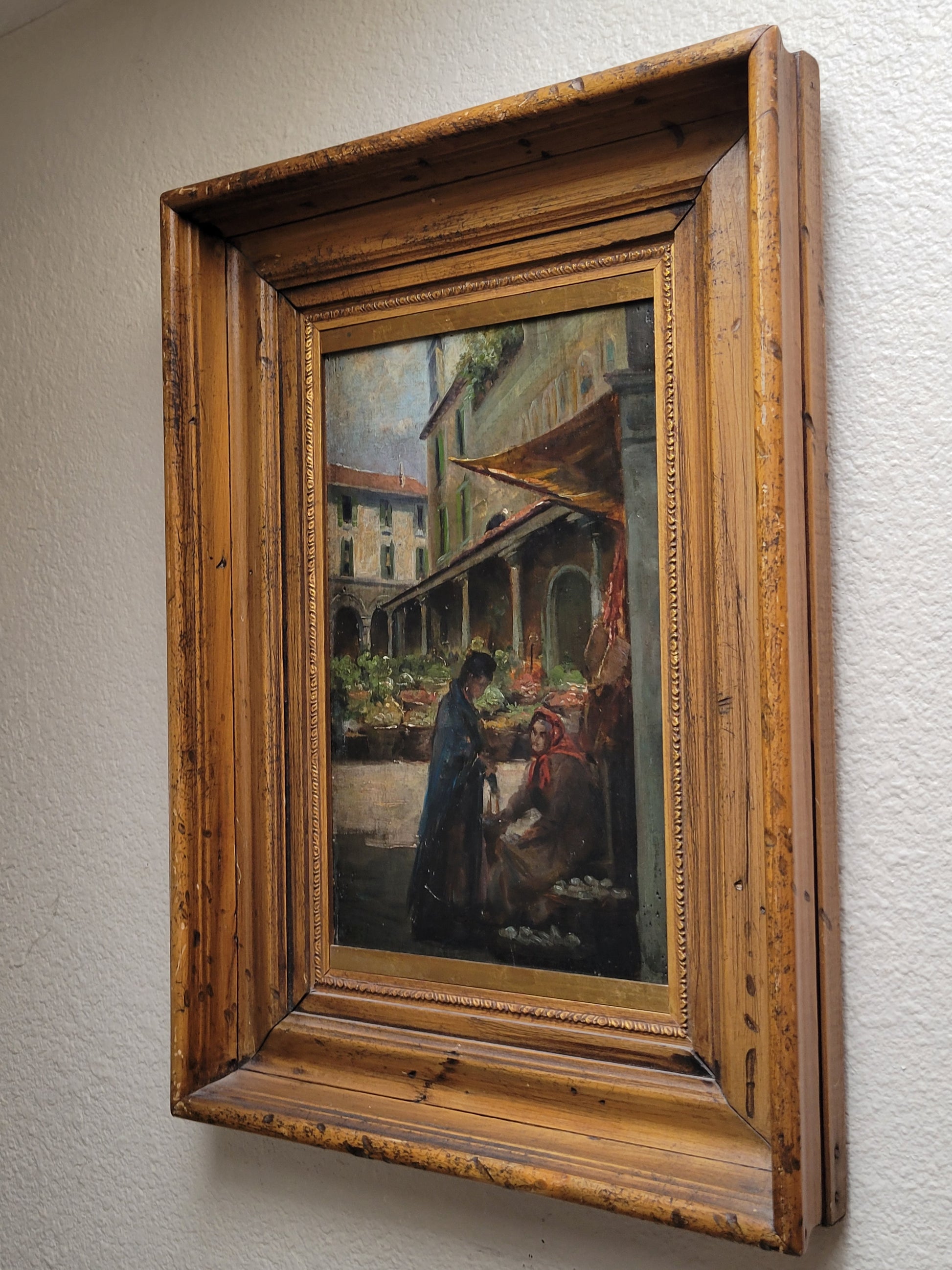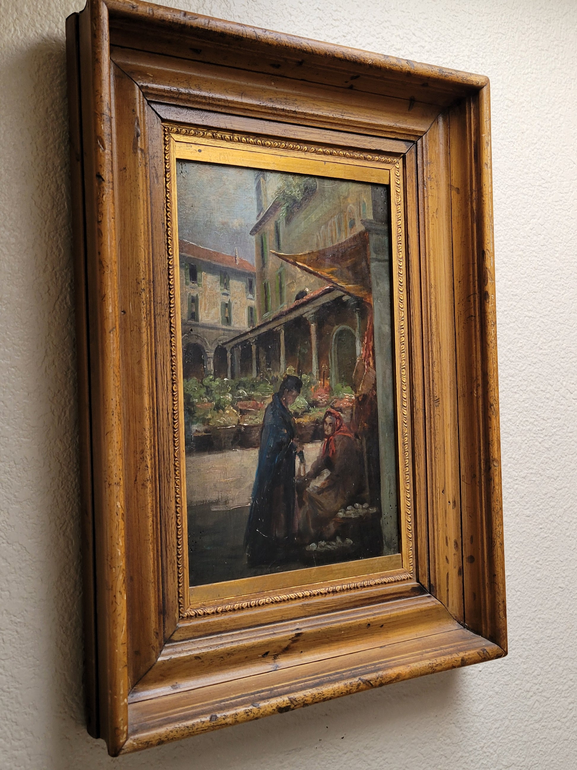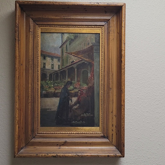 A beautiful and skillfully painted antique early 1900s oil paint on wood panel of a Venetian market scene. Signed in the lower left by M.S. Loresen (?). The scene includes buildings with shutters, colonnades, awnings, baskets of vegetables in the background. In the foreground lower right is a standing younger woman with a hanging purse, conversing with an older woman who is seated next to baskets of oysters, perhaps. The panel is framed in a beautiful antique (likely original) walnut and gold leaf wide frame. On the back is an old piece of paper with information about the painting.