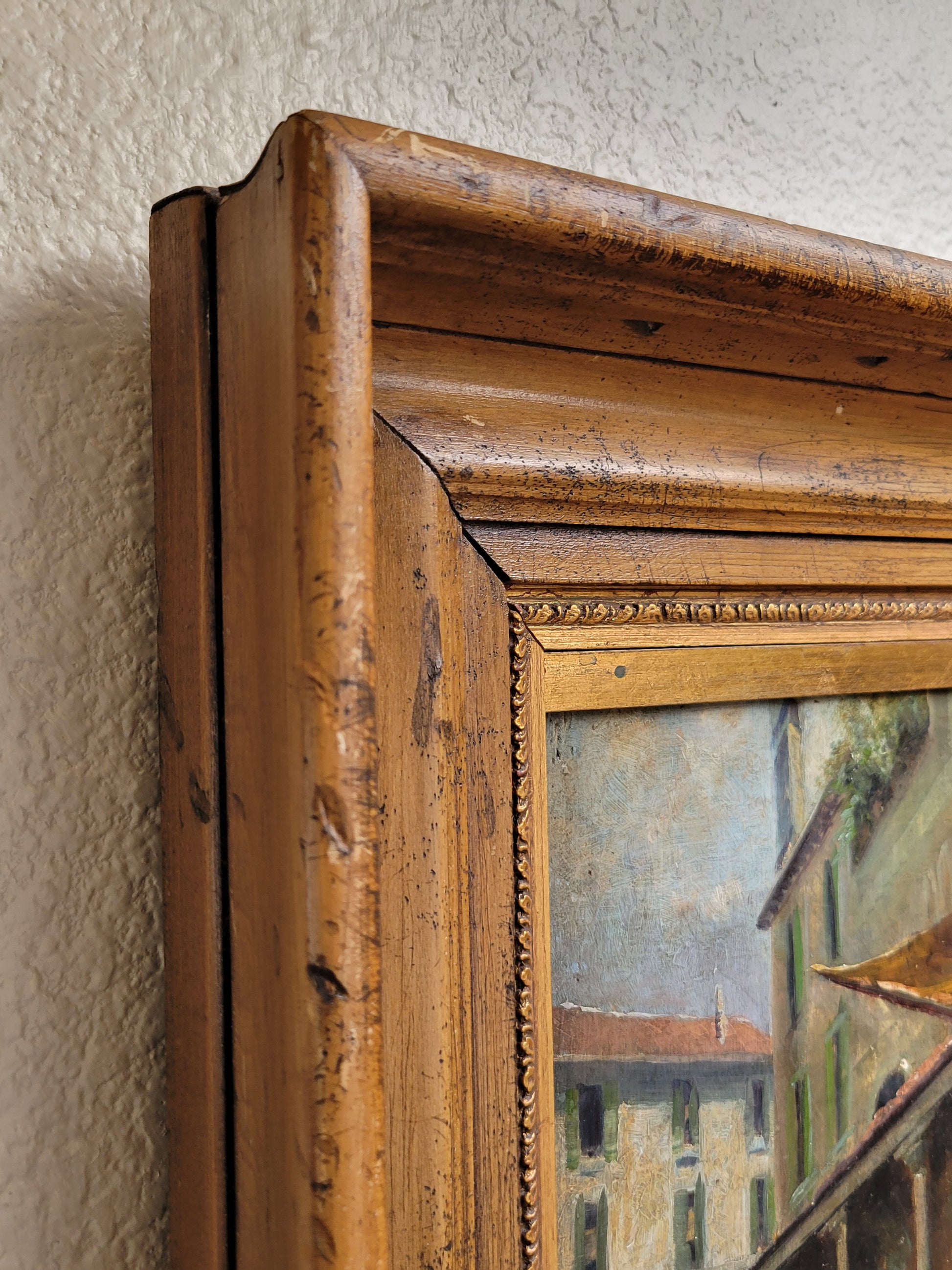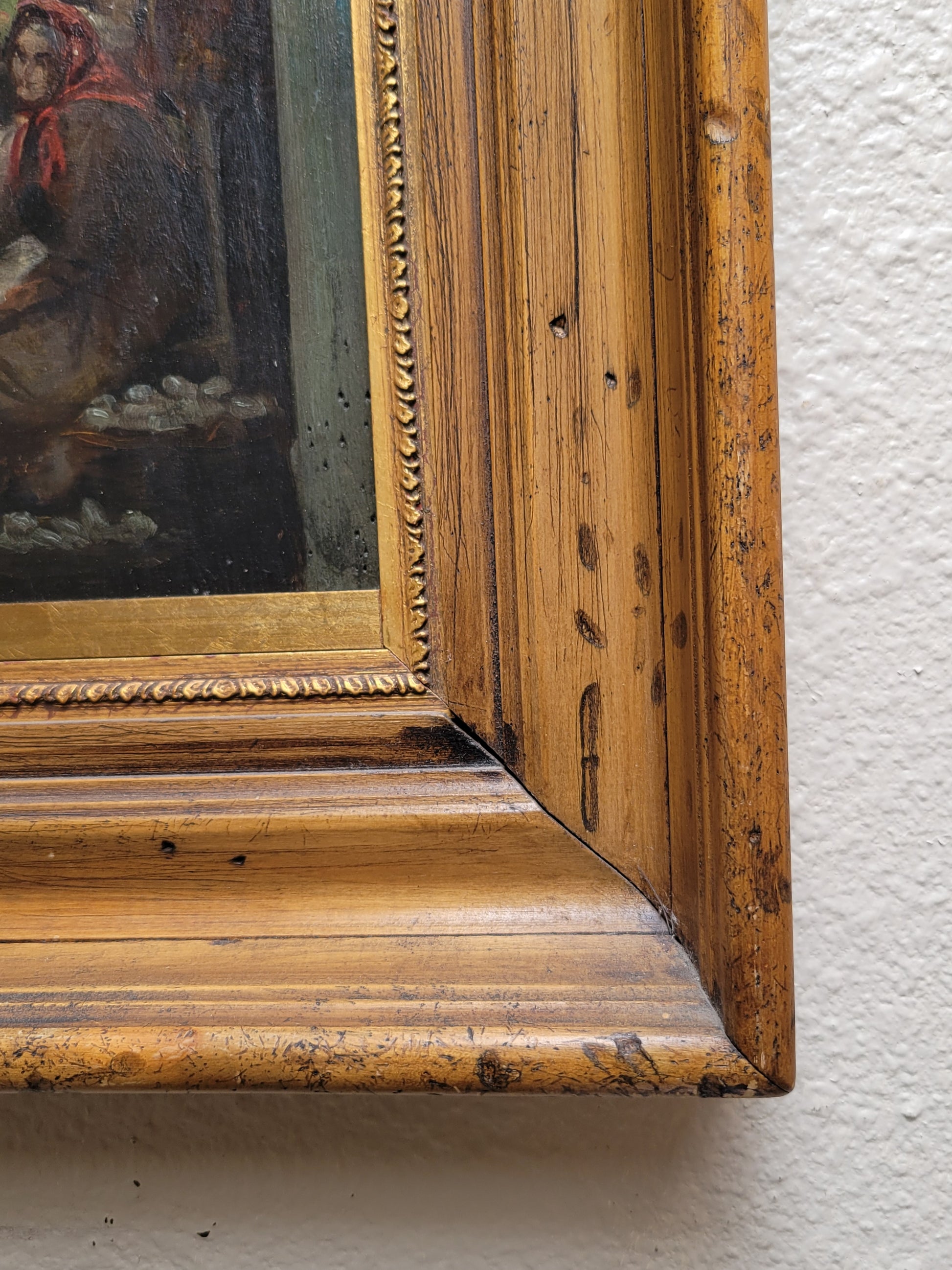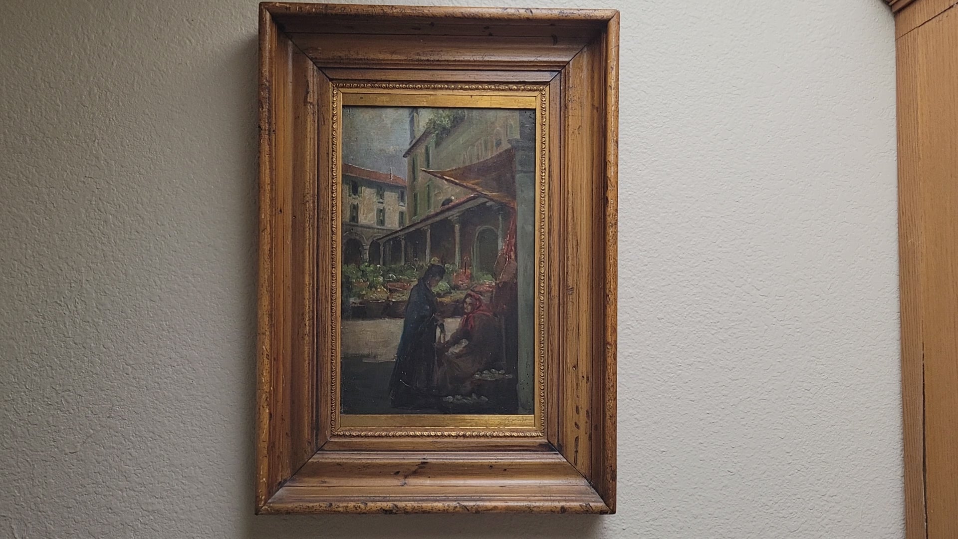 A beautiful and skillfully painted antique early 1900s oil paint on wood panel of a Venetian market scene. Signed in the lower left by M.S. Loresen (?). The scene includes buildings with shutters, colonnades, awnings, baskets of vegetables in the background. In the foreground lower right is a standing younger woman with a hanging purse, conversing with an older woman who is seated next to baskets of oysters, perhaps. The panel is framed in a beautiful antique (likely original) walnut and gold leaf wide frame. On the back is an old piece of paper with information about the painting.
