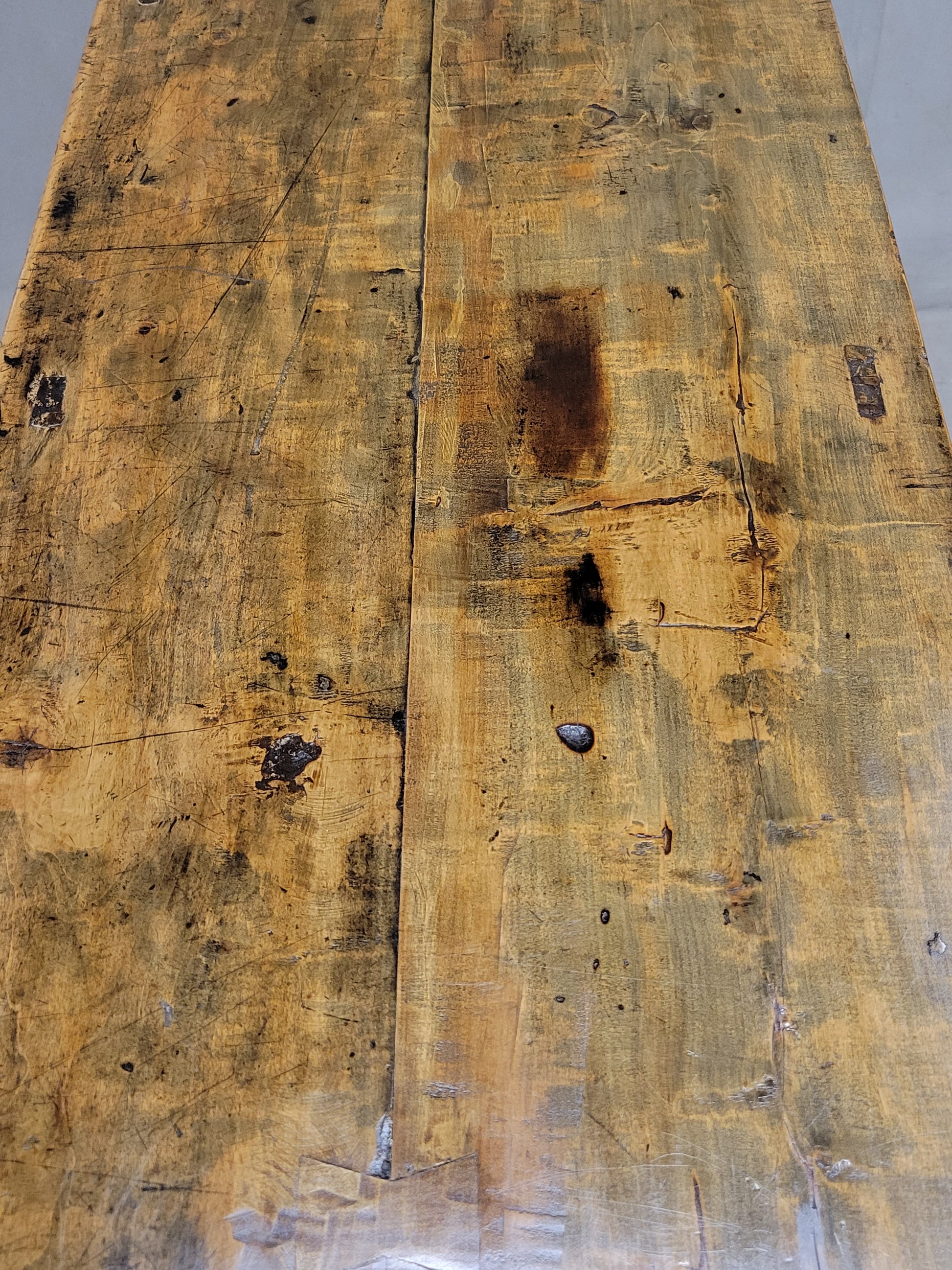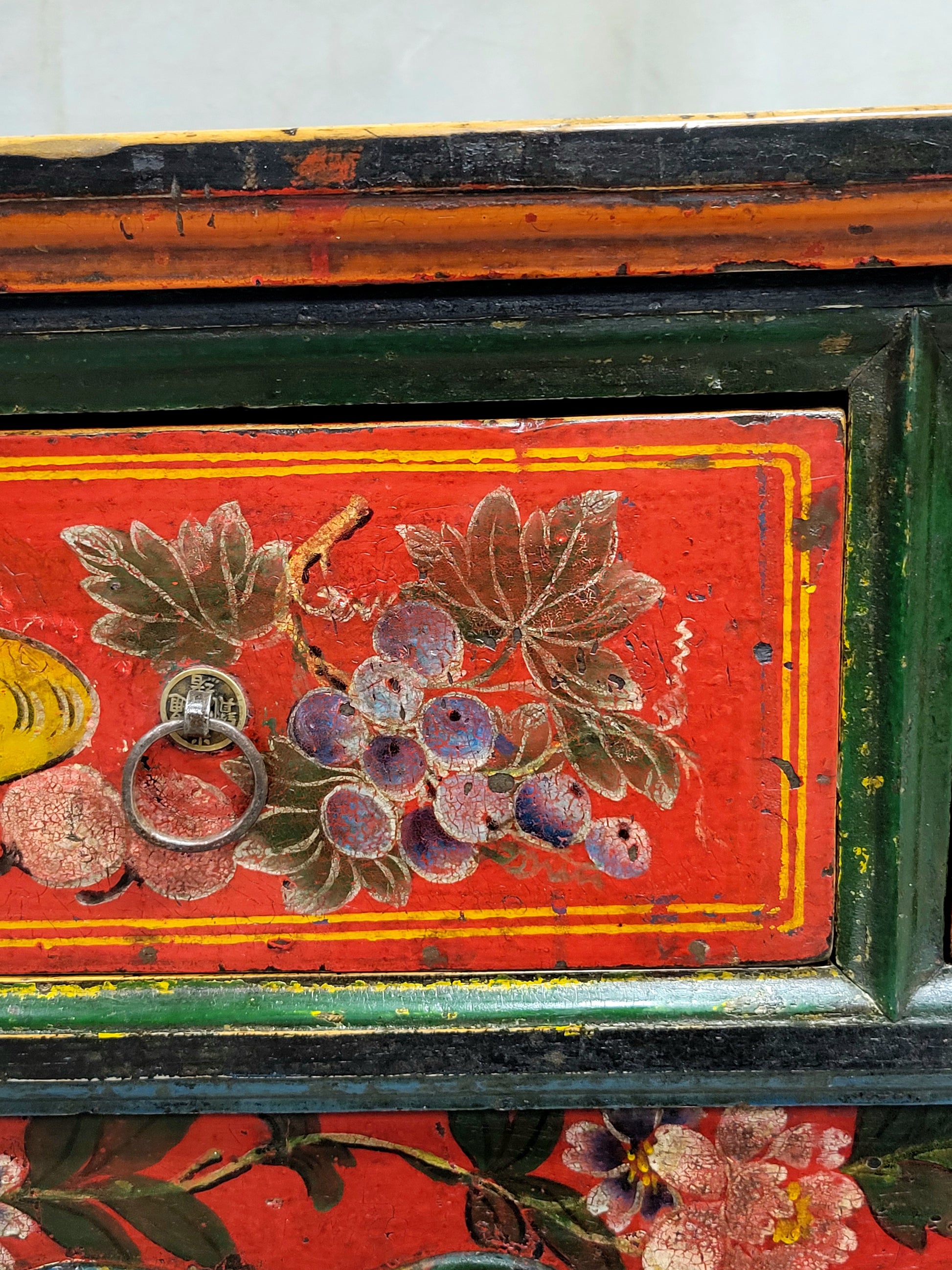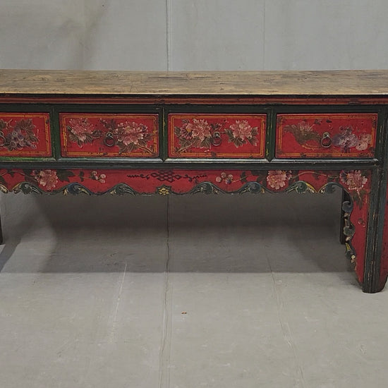 An exceptional early 20th century four drawer altar or console table from China. The front is embellished with incised and pierced carving and lacquer in shades of red, black blue and white. Imagery of flowers, grapes and cloud formations along the legs, which are reminiscent of the style of clouds found on Tibetan furniture. Made of mixed woods including pine and elm. The distressed two plank, natural wood top with exposed tenons and butterfly joints has a satin lacquer finish. The mortise and tenon construction tight and sturdy. The drawers glide smoothly by pulling on original iron ring pulls. This piece is stunning, sure to be the focal point of any room while offering practical storage.