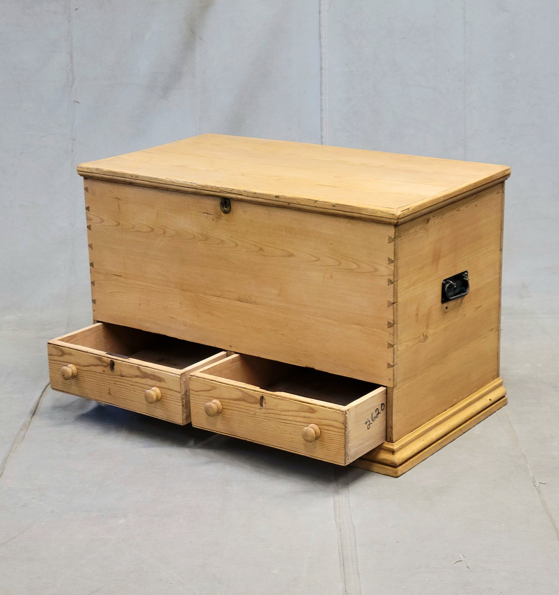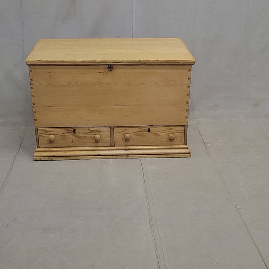 A charming and functional antique circa 1900 Eastern European natural pine blanket chest. Beautiful dovetail construction is evident at the corners. Two drawers with old knobs at the bottom of the chest allow for storage without needing to open the top. Old key escutcheons are present but there is no key. Handles on the sides are replacements. An interior candle box with flip up lid acts as a support for the lid when it is open. The surface of the pine is waxed... just buff with a soft brush or an old t-shirt to increase the shine. The natural patina will develop and improve with age. Could be used at the foot of a bed, in an entryway or hallway, or as a coffee table.