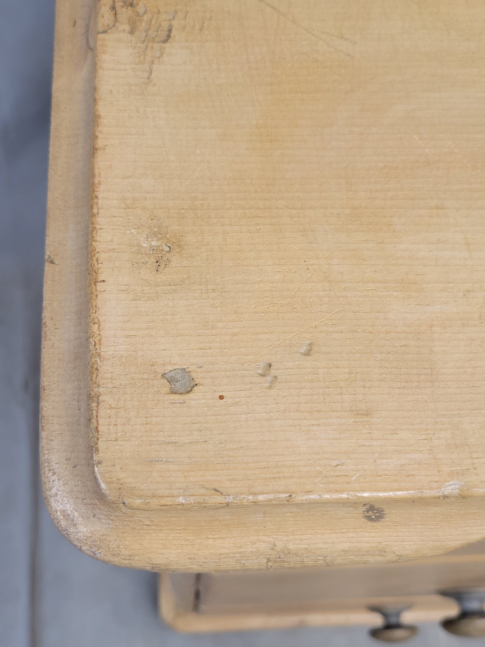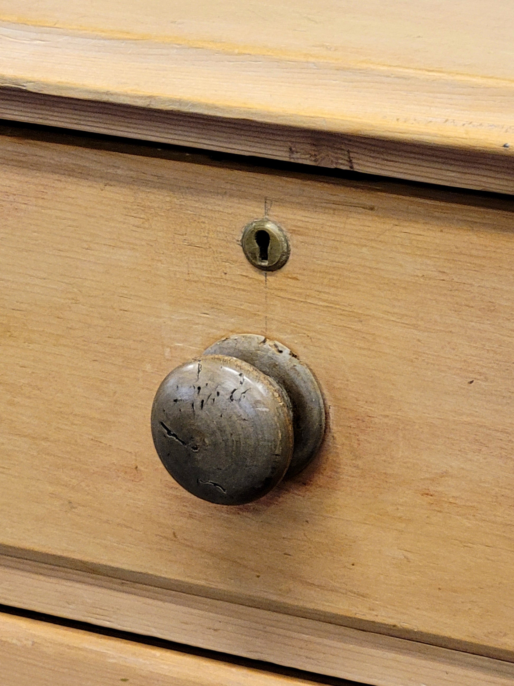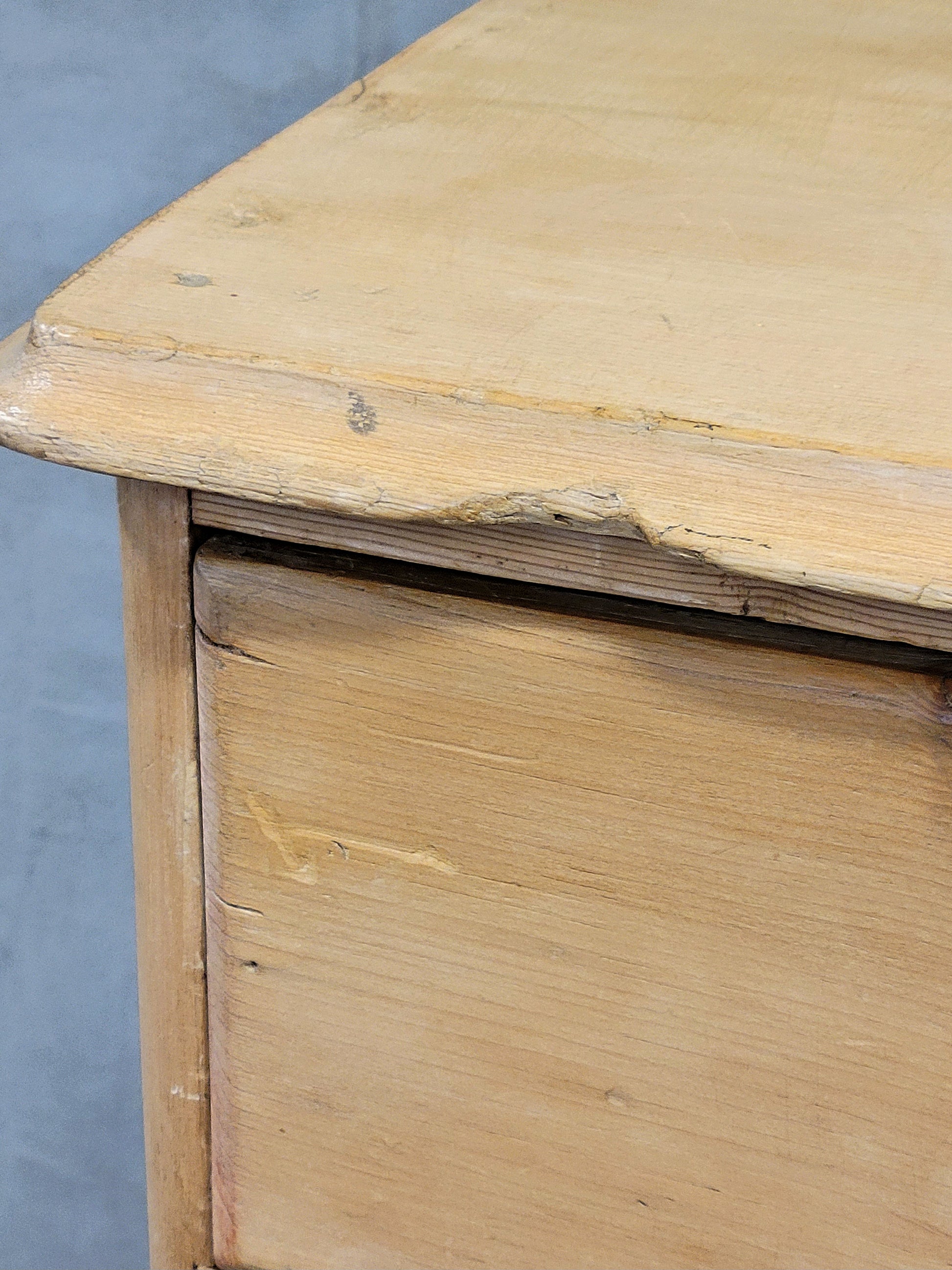 In as found condition. At some point in time this dresser was stripped and bleached. It is now a pale bleached pine color. The knobs are a darker hardwood which add contrast. The dresser is strong and functional with drawers that glide smoothly. This dresser has been waxed with Fiddes Supreme Wax... just buff with an old t-shirt or soft brush to increase the shine.