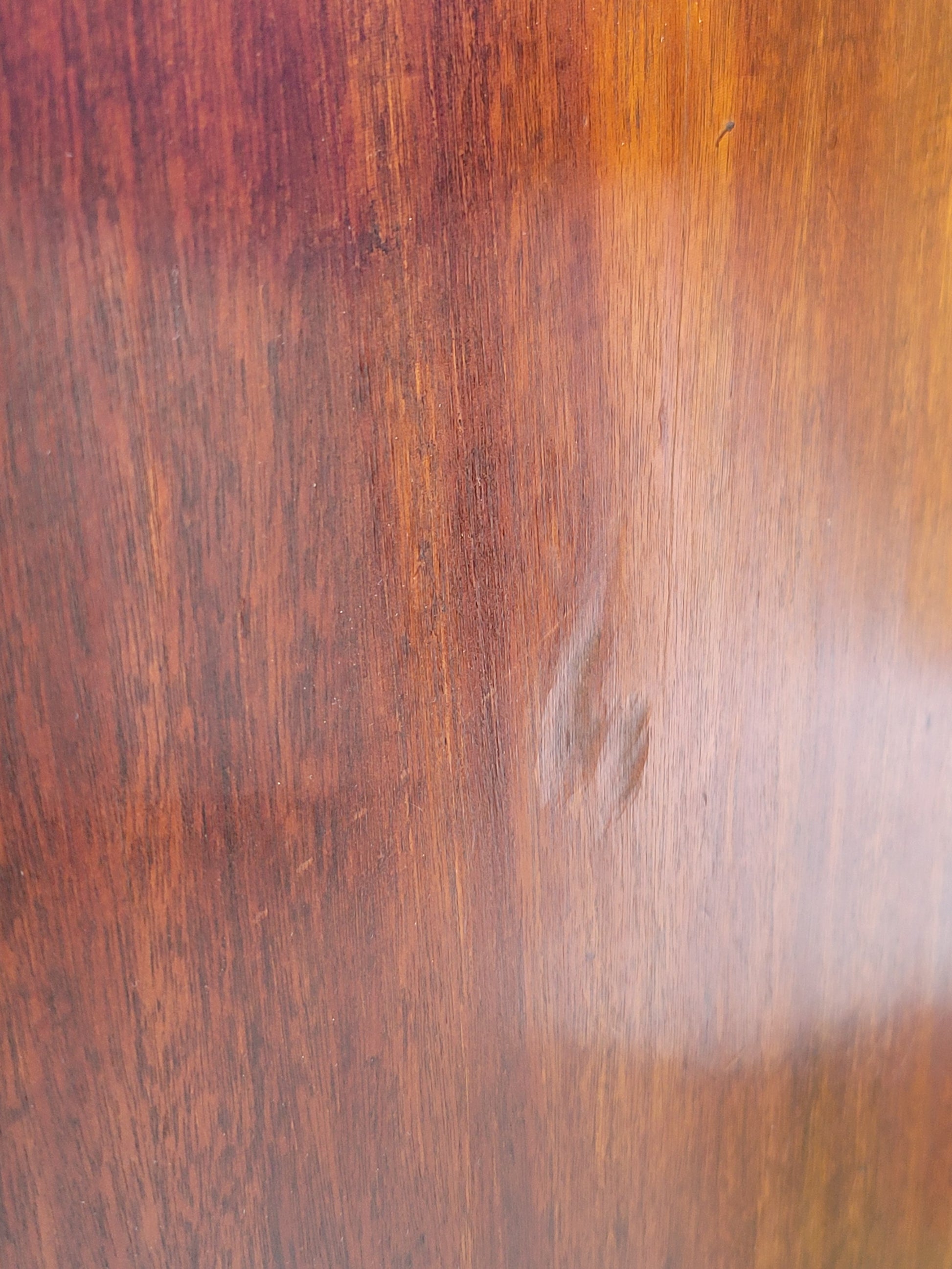 Condition commensurate with age and use. The drawers glide smoothly. The wood surface has small imperfections including scratches and discolorations which one would expect from a piece of furniture of this age. There are some dark spots in the finish, see last photo, as well as filled cracks at the corners on the top. Drawer edge trim on the 3rd drawer down has an indented portion which measures approx. 1.5"long, see photos. This is a strong and sturdy piece, ready for many years of use.