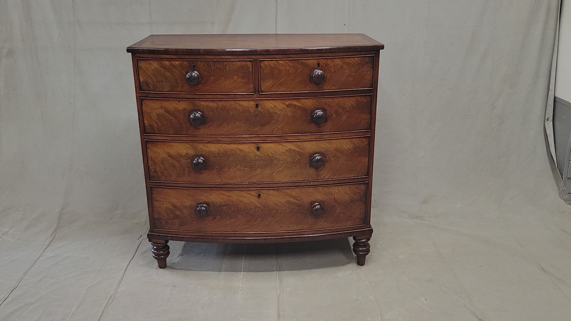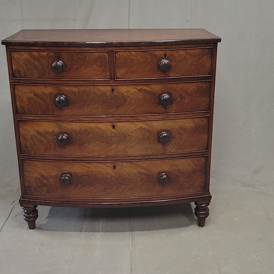 An absolutely gorgeous antique English Edwardian period (circa 1900) two-tone figured mahogany dresser chest of drawers with original knobs. This sturdy dresser has five drawers that glide smoothly and offer ample storage. The casework sits upon prominent turned turnip feet that give this piece such character. Hand cut dovetails are evident on the drawers. The wood on this dresser absolutely glows and the unique two tone figured mahogany is so distinctive and is a testament to the excellent craftsman that created this beautiful chest of drawers. Such a functional and truly stunning piece of furniture.