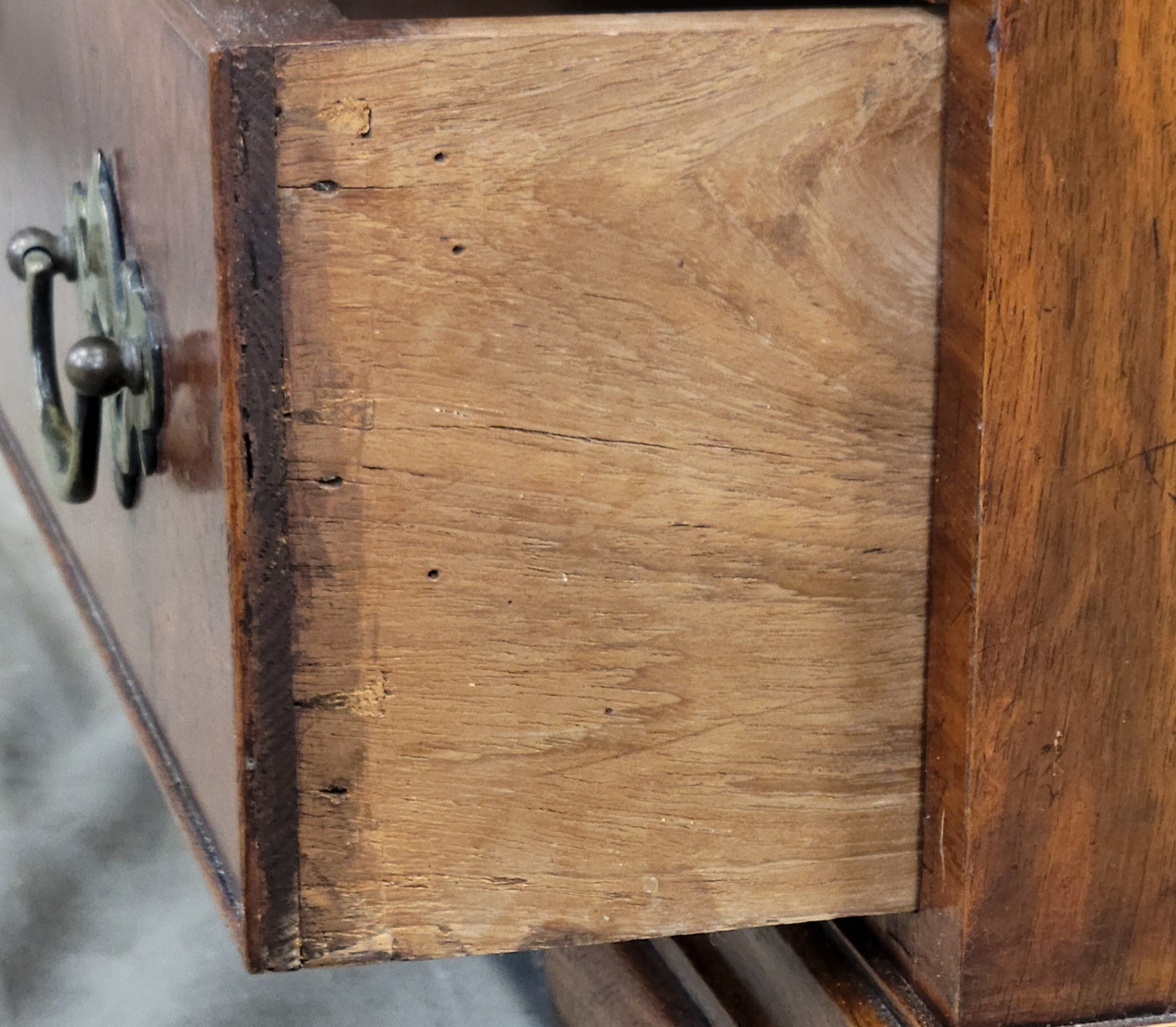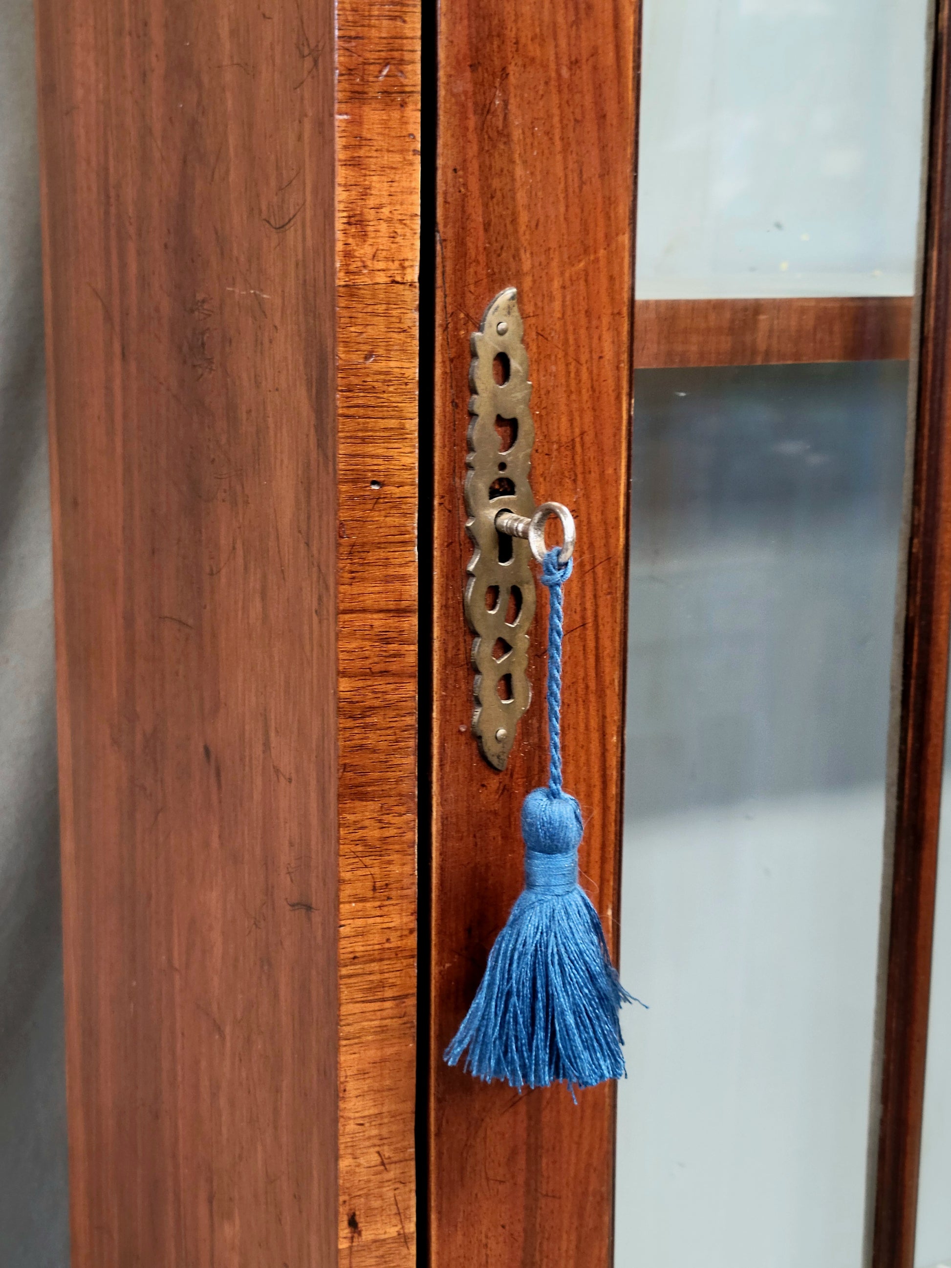 Condition commensurate with age and use. Imperfections in the mahogany veneer. The interior has been painted and there are random surface scratches in the paint. The door locks with the included key with blue tassel.