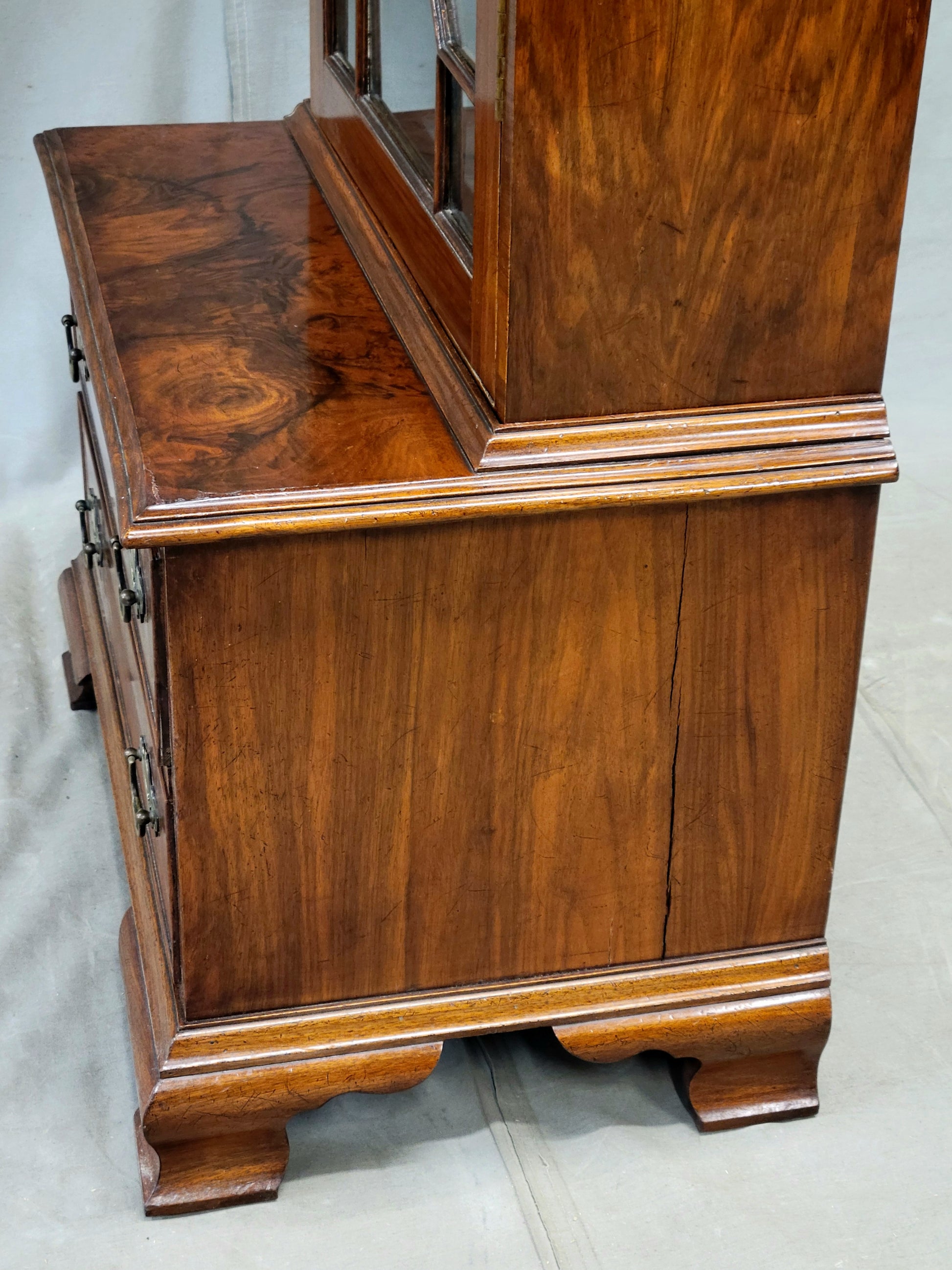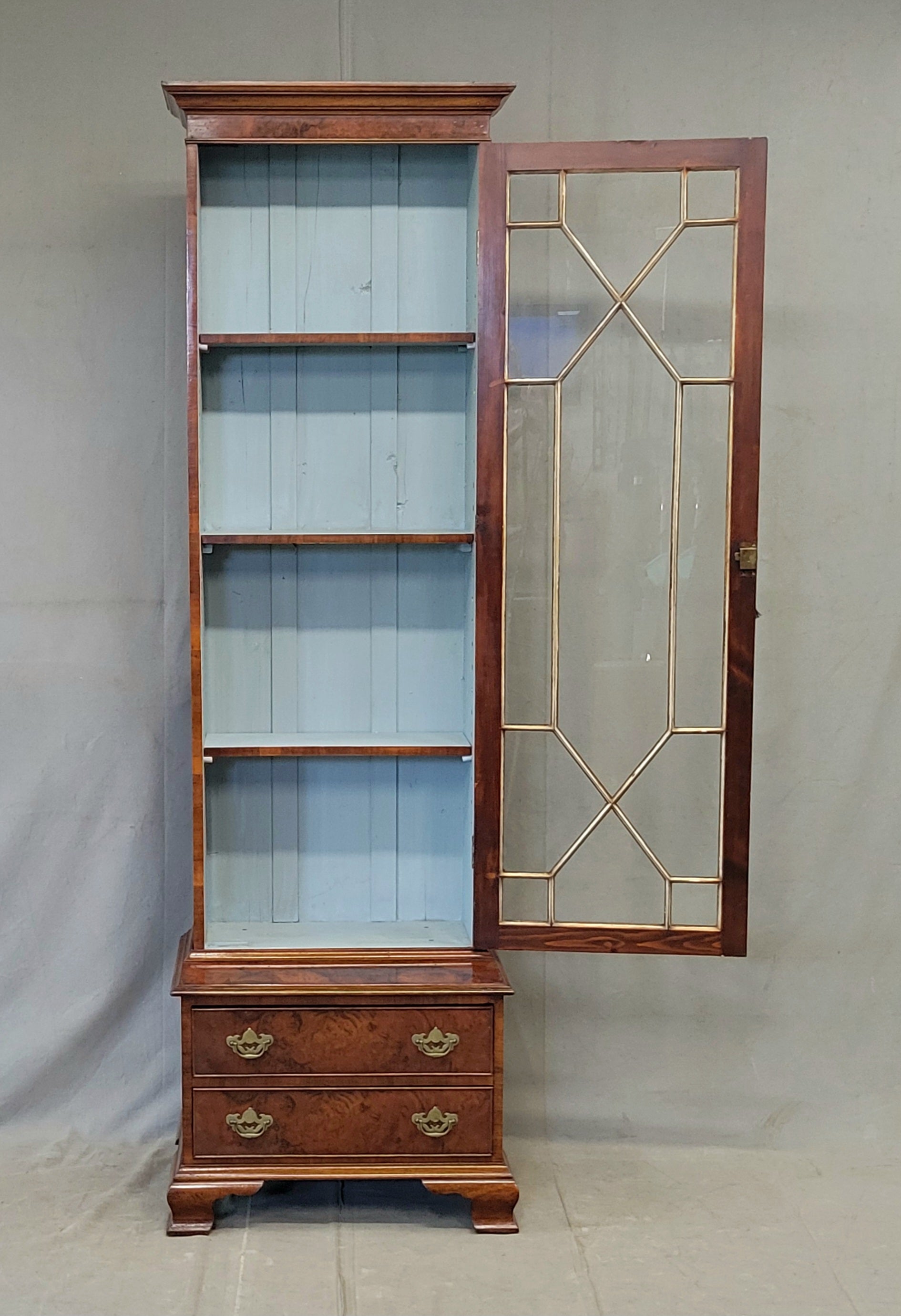 A beautiful, elegantly proportioned. antique 1920s English mahogany two-piece display curio cabinet. The glass door is artistically divided with diamond patterned mullions and original glass. The center shelf is fixed but the upper and lower shelves are adjustable with pegs. The bottom portion of the cabinet has two storage drawers with original Chippendale brass pulls. The glass door portion screws securely to the base with four screws, see last photo. Perfect for displaying china and collectables.