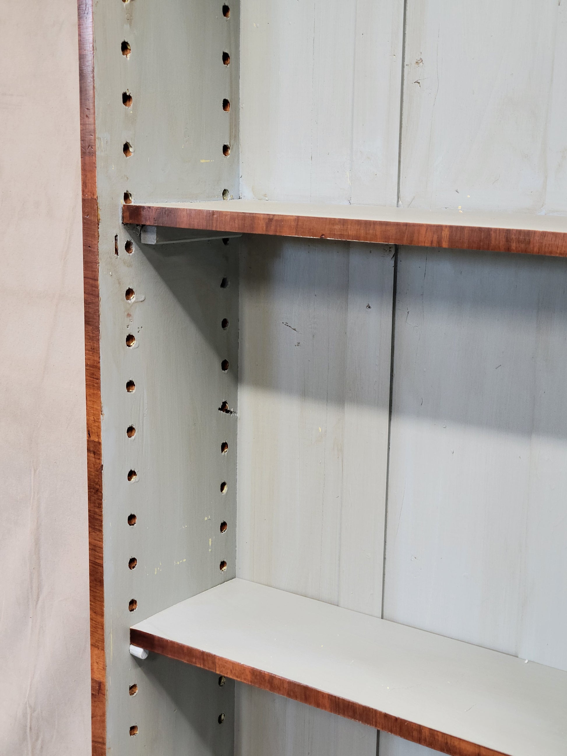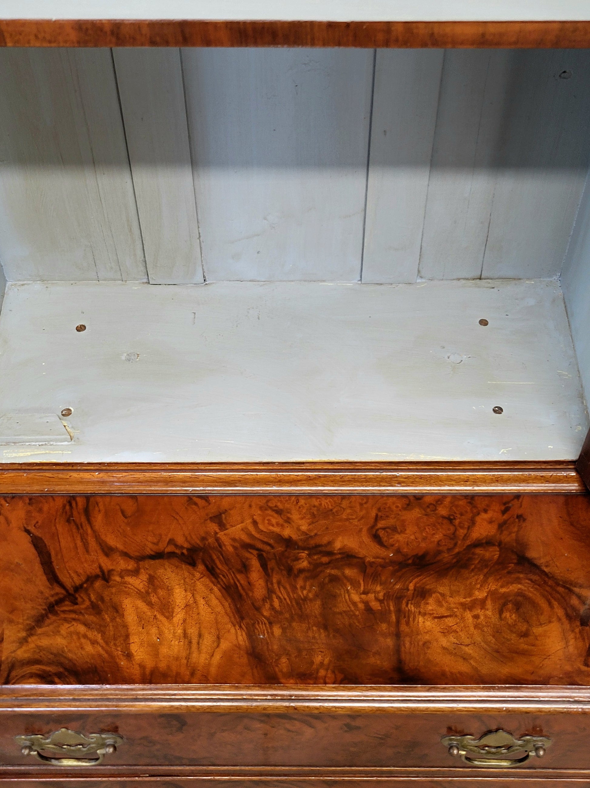 Random scratches and small chips in the mahogany veneer. Splits in the wood on either side of the bottom cabinet portion, see photos. The interior blue paint is modern and adds a decorative element.
