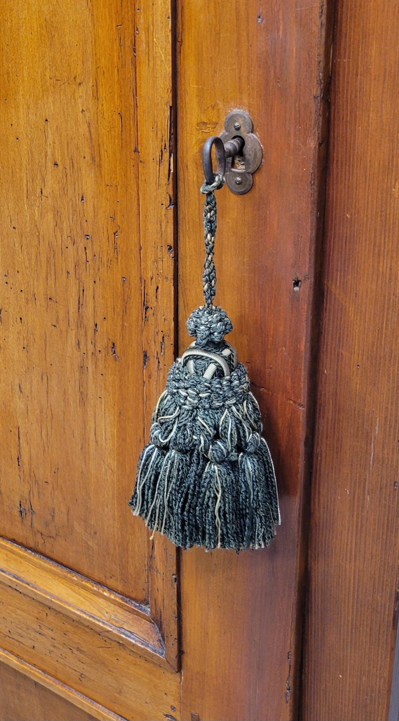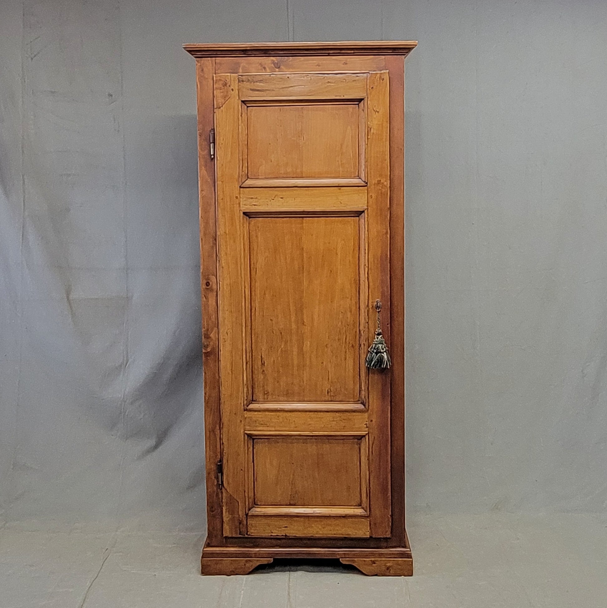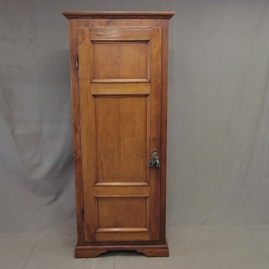 A beautiful antique French solid door storage cupboard has three shelves and a working key! The door is constructed of old cherry and the case complements the door, made of rich golden pine. This tall, narrow cabinet offers a lot of closed storage without taking a up large footprint in your space. The door closes and locks with an original key that has a large dark green tassel attached. The wood overall is rustic and distressed from over a century of use. Because of the mixed woods, it is likely that the cherry door was repurposed at some point in time and a woodworker made the reclaimed pine casework to attach the door.