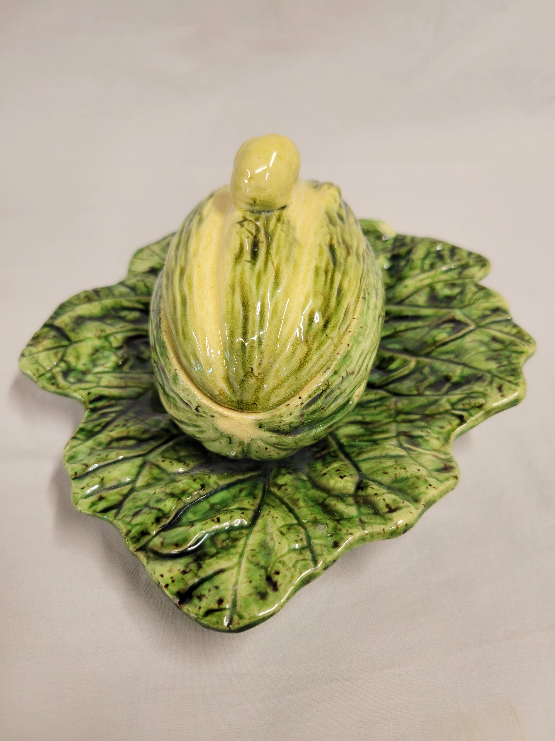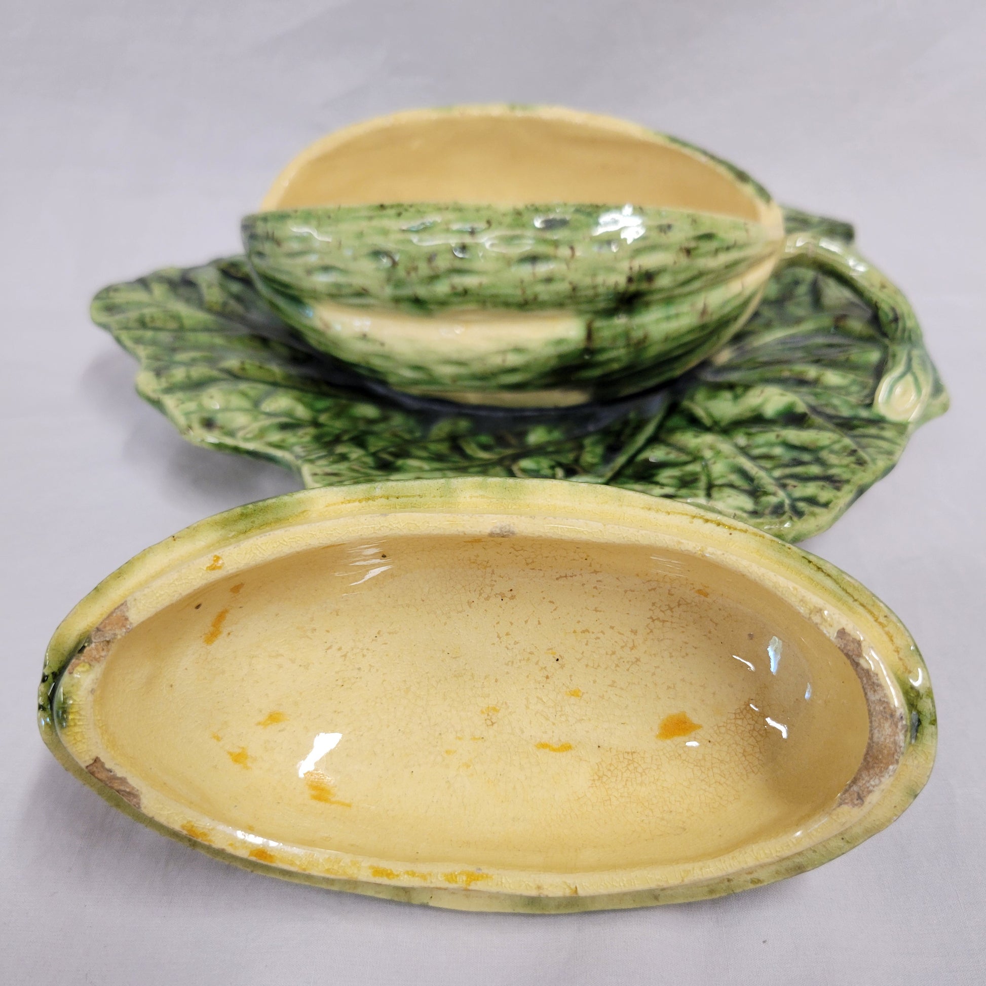 A gorgeous antique art nouveau 1920s or 1930s lidded melon dish which is attached to a leaf plate. The craftsmanship of this piece is outstanding though it does not bear maker's marks. It is of the quality and characteristics of French Sarreguemines. It is possible that this piece was made by Sarreguemines but not marked due to the imperfections in the glaze at the bottom of the melon bowl. Not all pieces by this French maker were marked. There is subtle crazing in the old glaze. This would be a wonderful addition to a collection of fruit or vegetable antique ceramics. A wonderful holiday or wedding gift!
