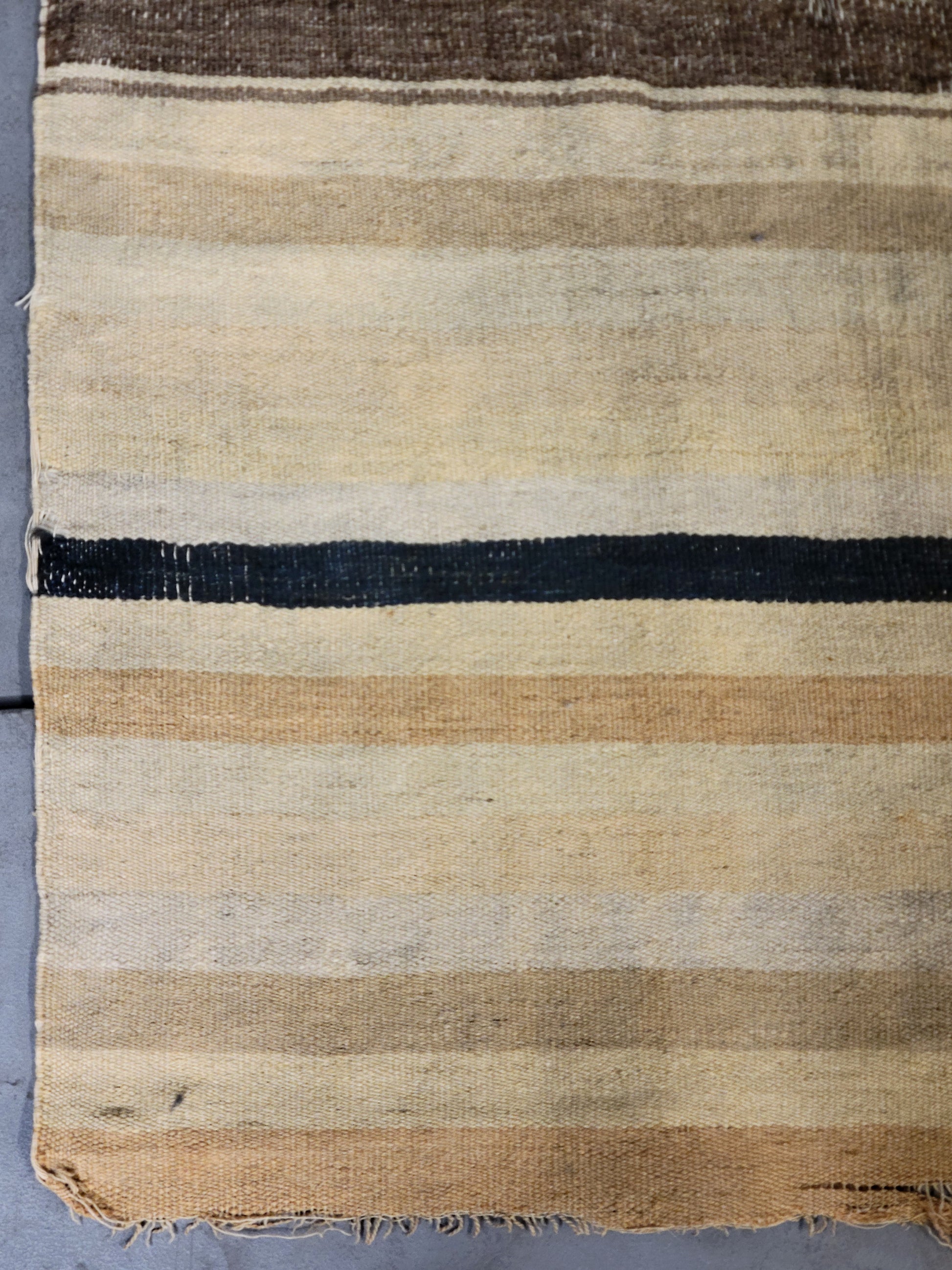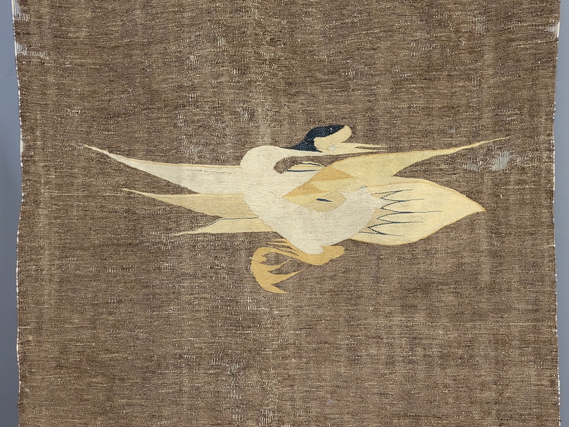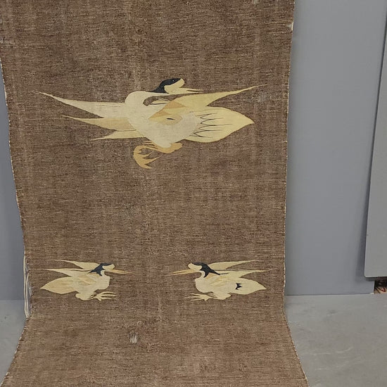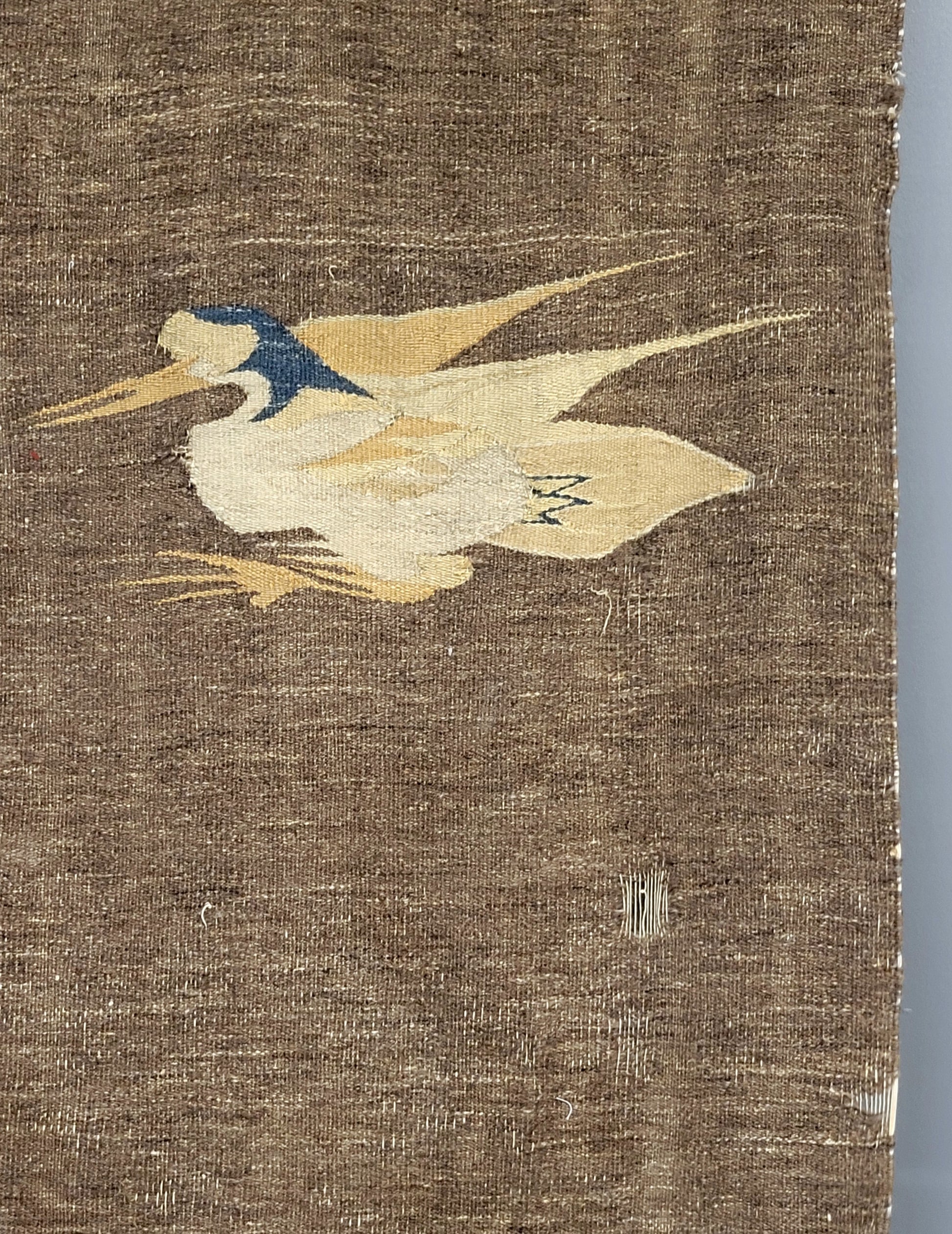 A stunning, large antique circa 1920 Mongolian tapestry woven wool blanket with cranes as well as banding at the top and bottom. Vegetable dyed wool weft on cotton warp in shades of brown, black, cream, tan and peach. The birds are beautifully woven into the brown ground. An amazing piece for a collector of textiles. It would be stunning hung on a large wall. Random spots of wear and fraying, see photos and video.