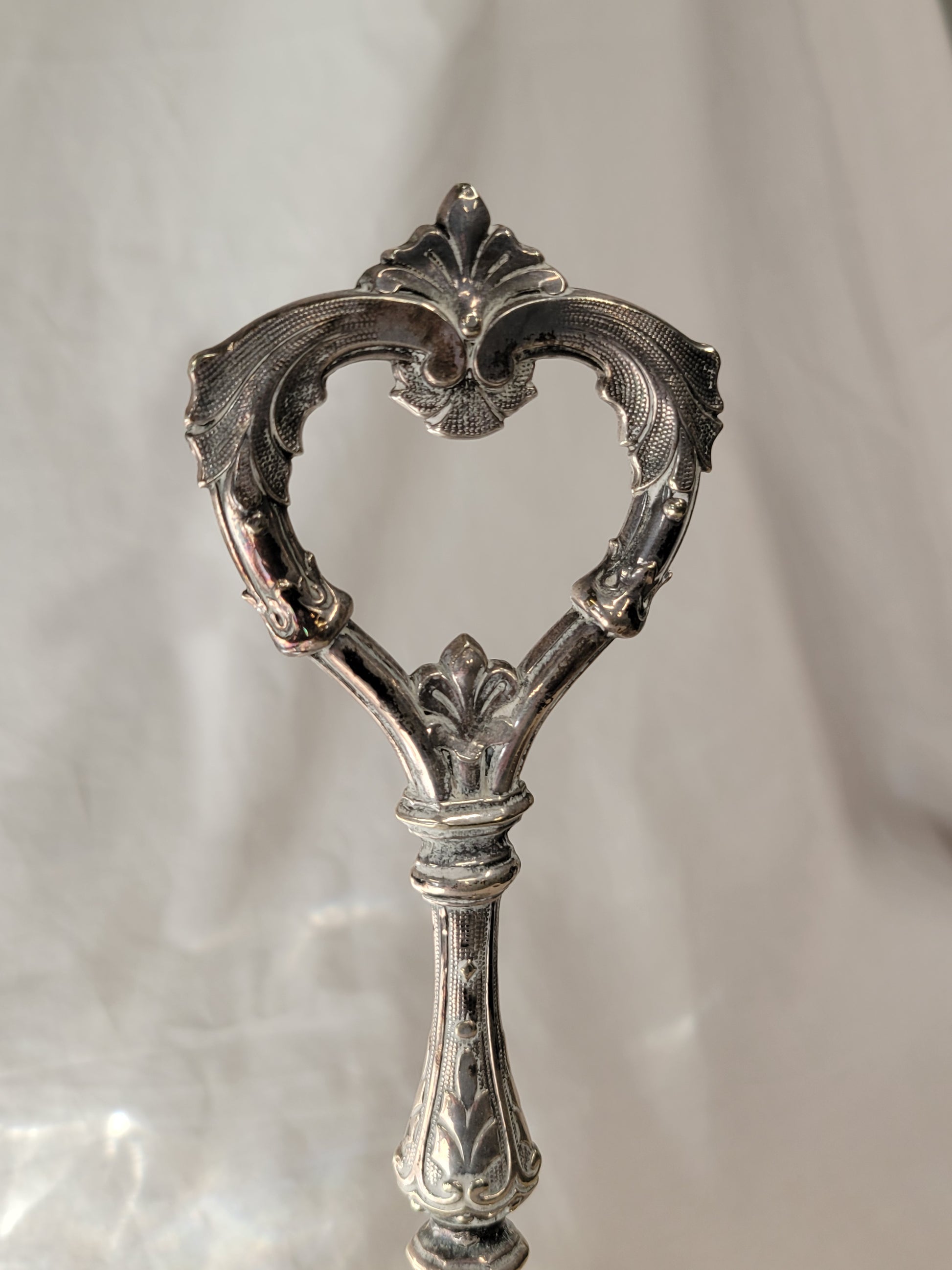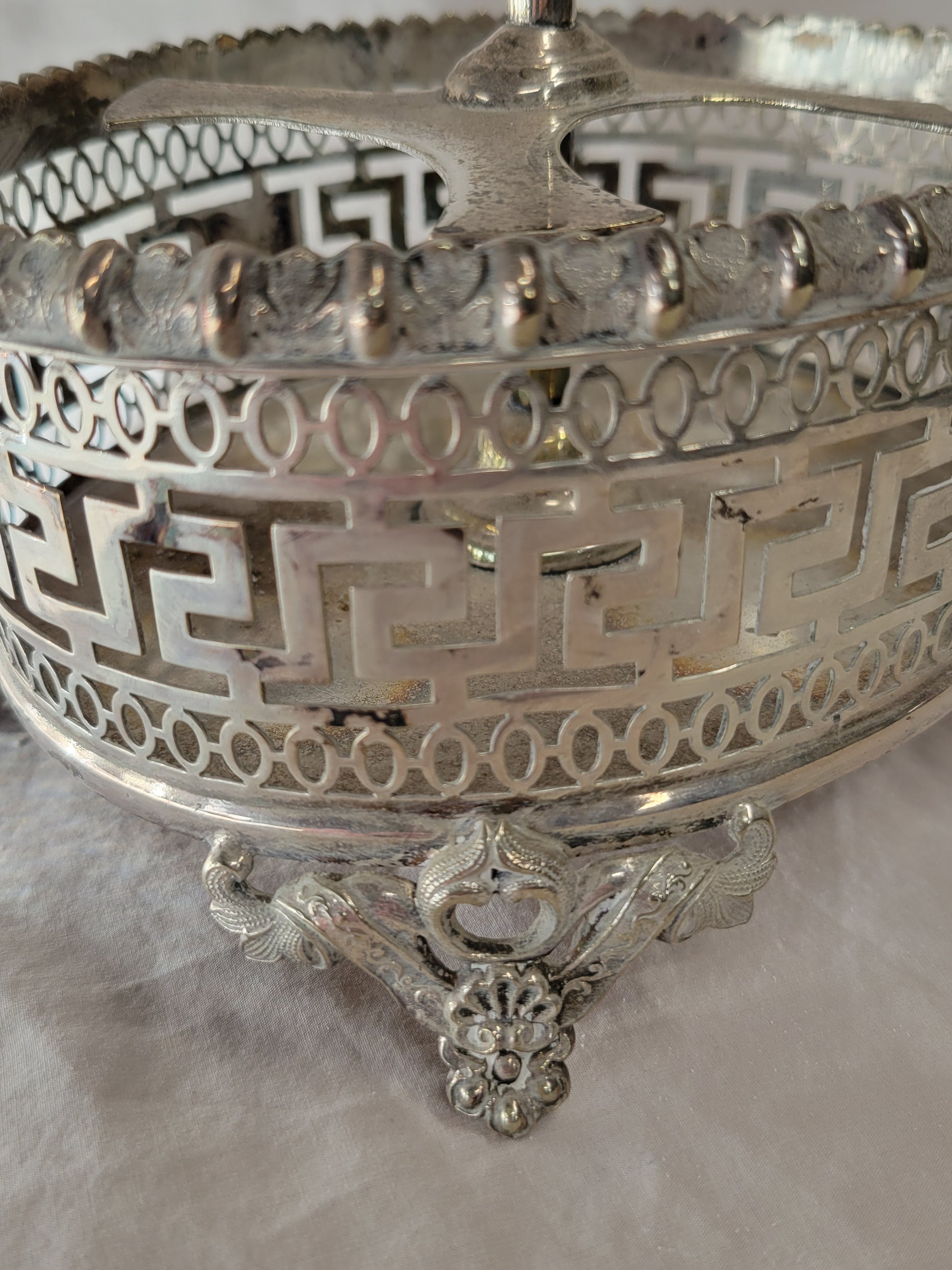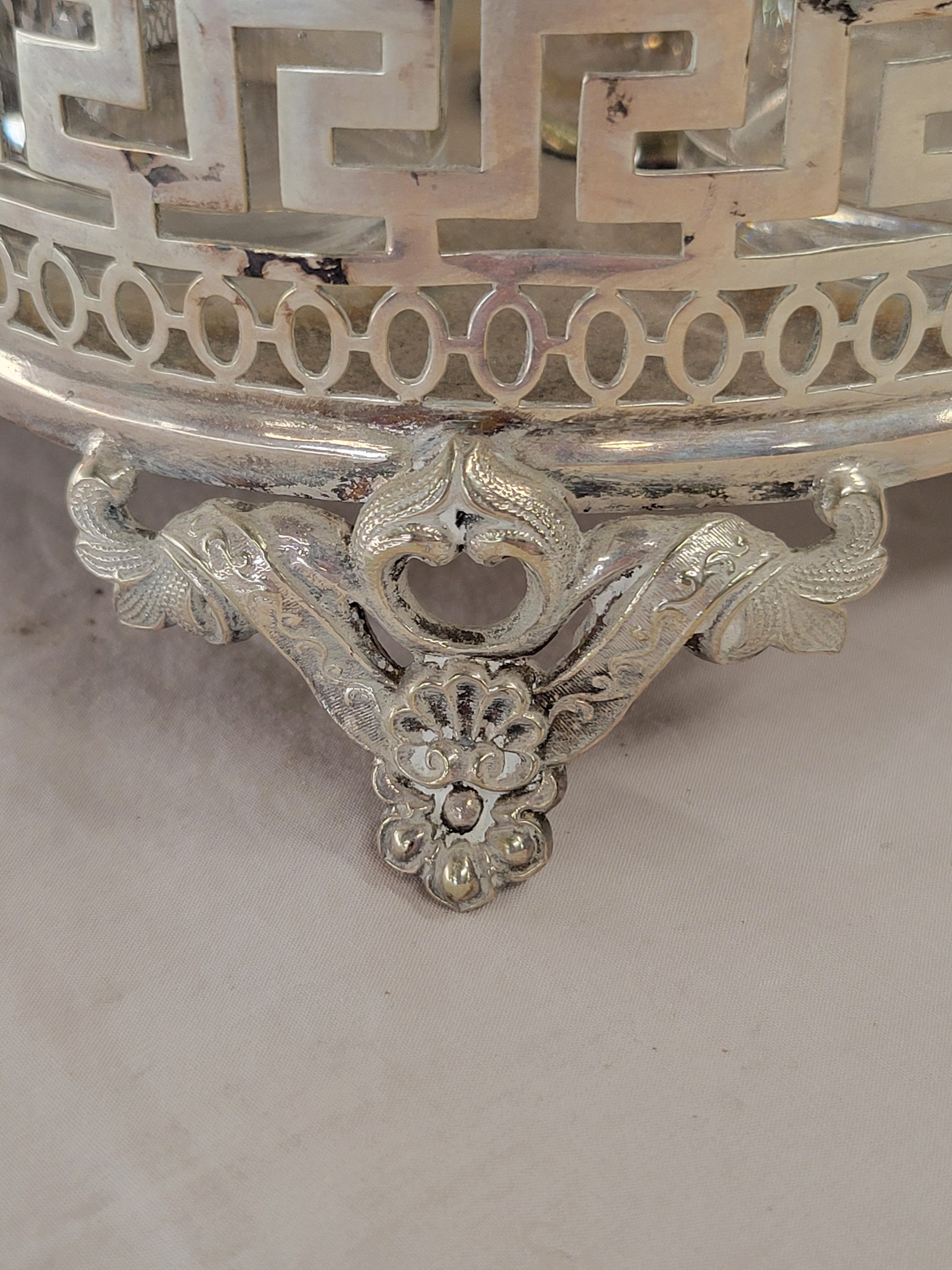 This stunning antique circa 1890 silverplate and crystal four round bottle cruet set features an elaborate and distinctive neoclassical pierced design in the silver holder. This cruet set could be from either the USA or England. Two bottles for pouring (oil and vinegar), a shaker bottle and a jam jar with a groove for the spoon nestle into the silver holder. The handle for the cruet set is heart shaped.