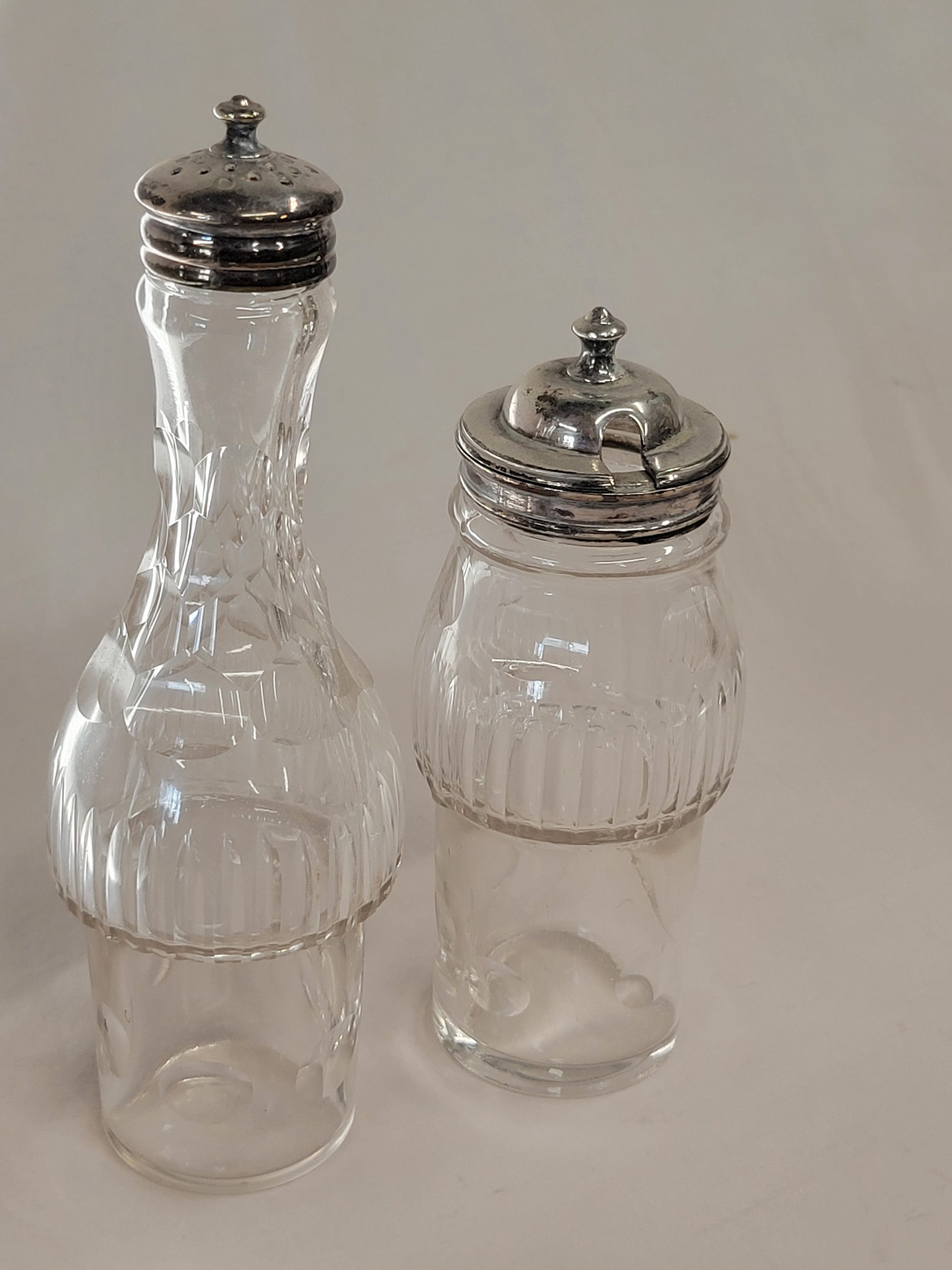Condition commensurate with age and use. Please note that there are small chips in the edge of the pour bottles, see photos. There is no spoon with the jam jar. One bottle stopper is slightly shorter than the other. There are no maker's marks on this cruet set.