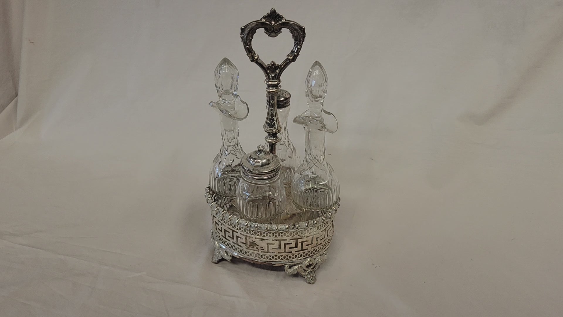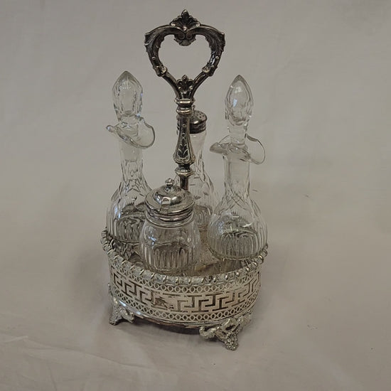 Antique Silverplate and Crystal Four Bottle Cruet Set