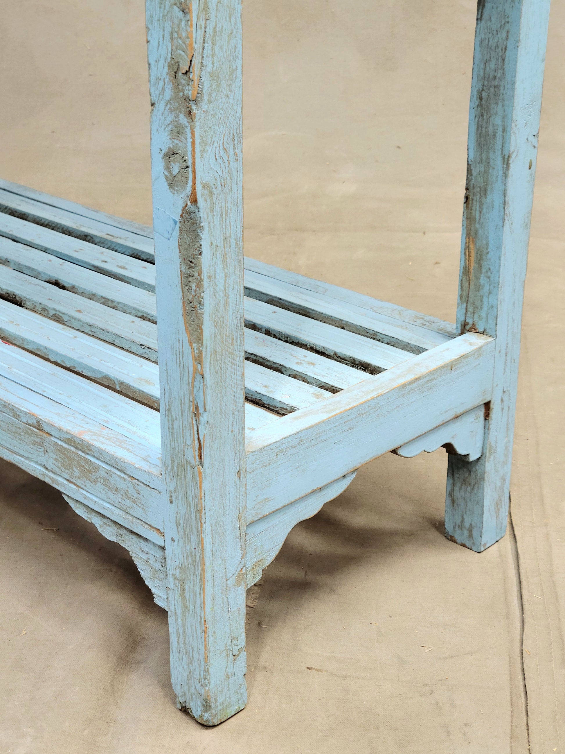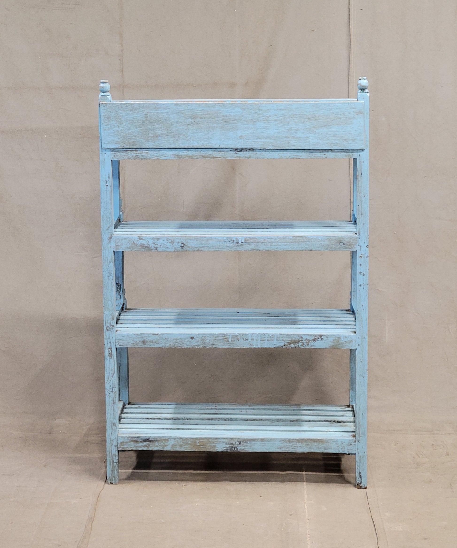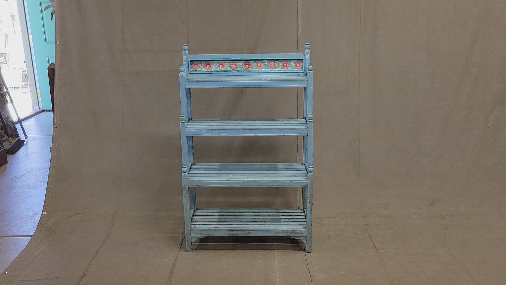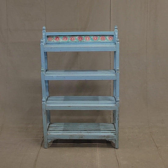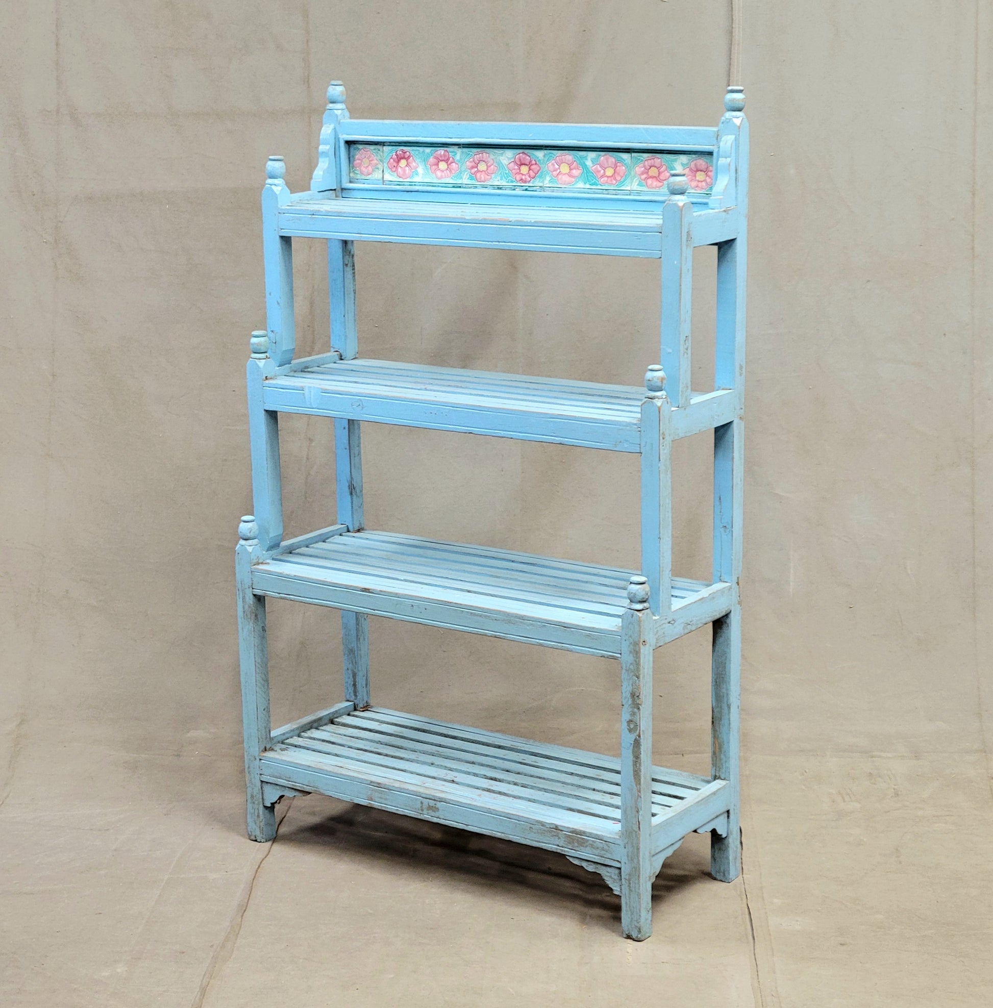 A charming and functional vintage Indian bookcase is so decorative! Painted a beautiful sky blue and ornamented at the top with pink floral tile this piece would offer a fun element to almost any space. The four slatted shelves offer storage for almost anything... books, curios, plants, or bathroom storage with towels and bath salts! Note the turned finials at the corners which add to the charm.