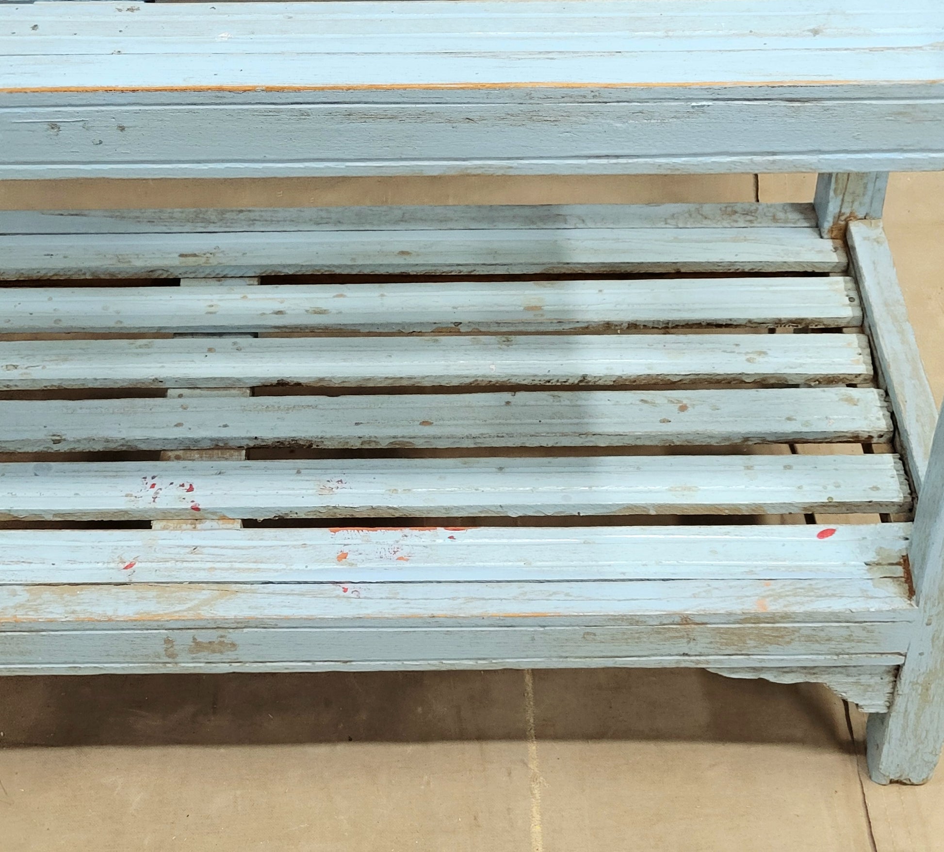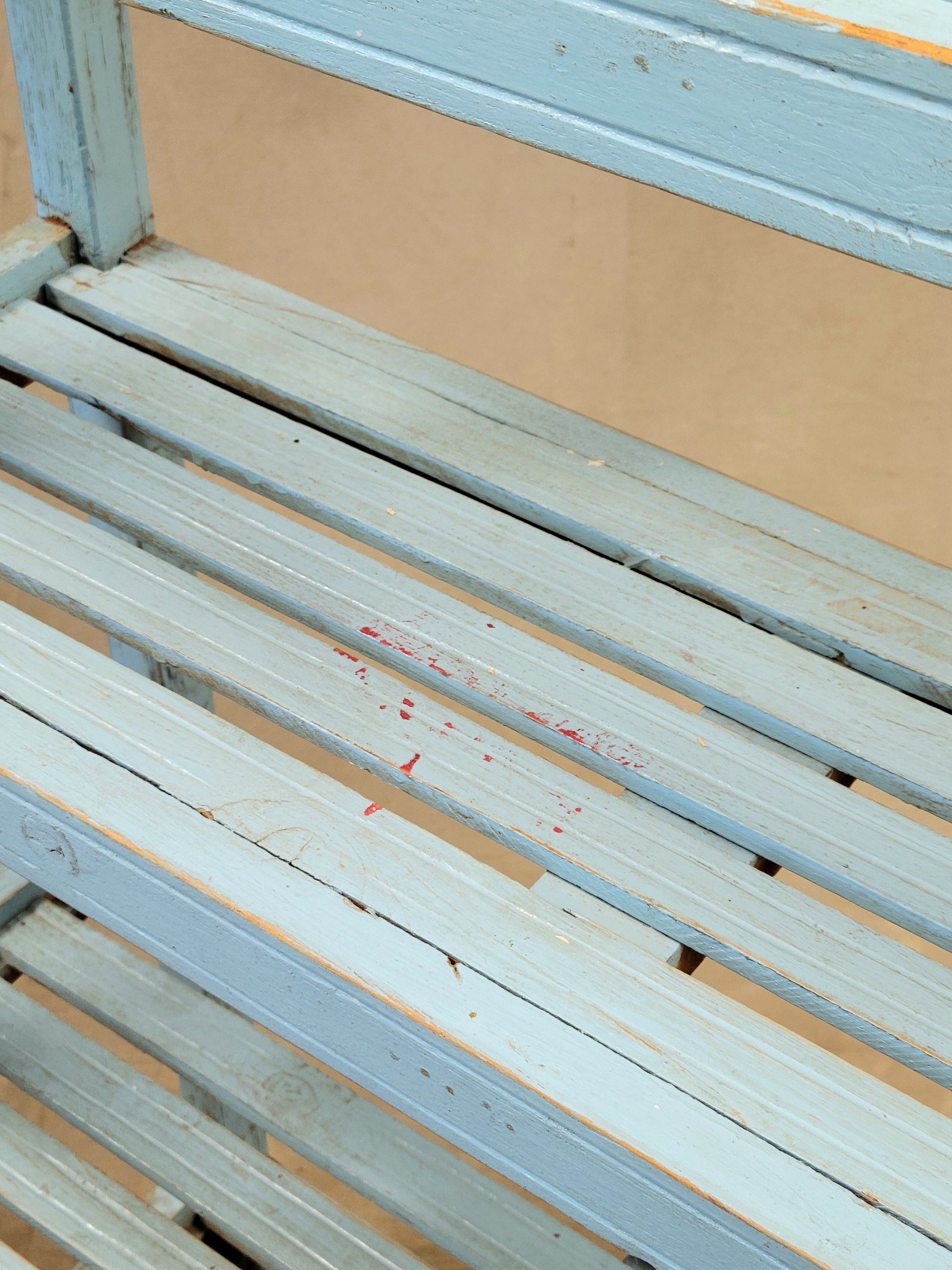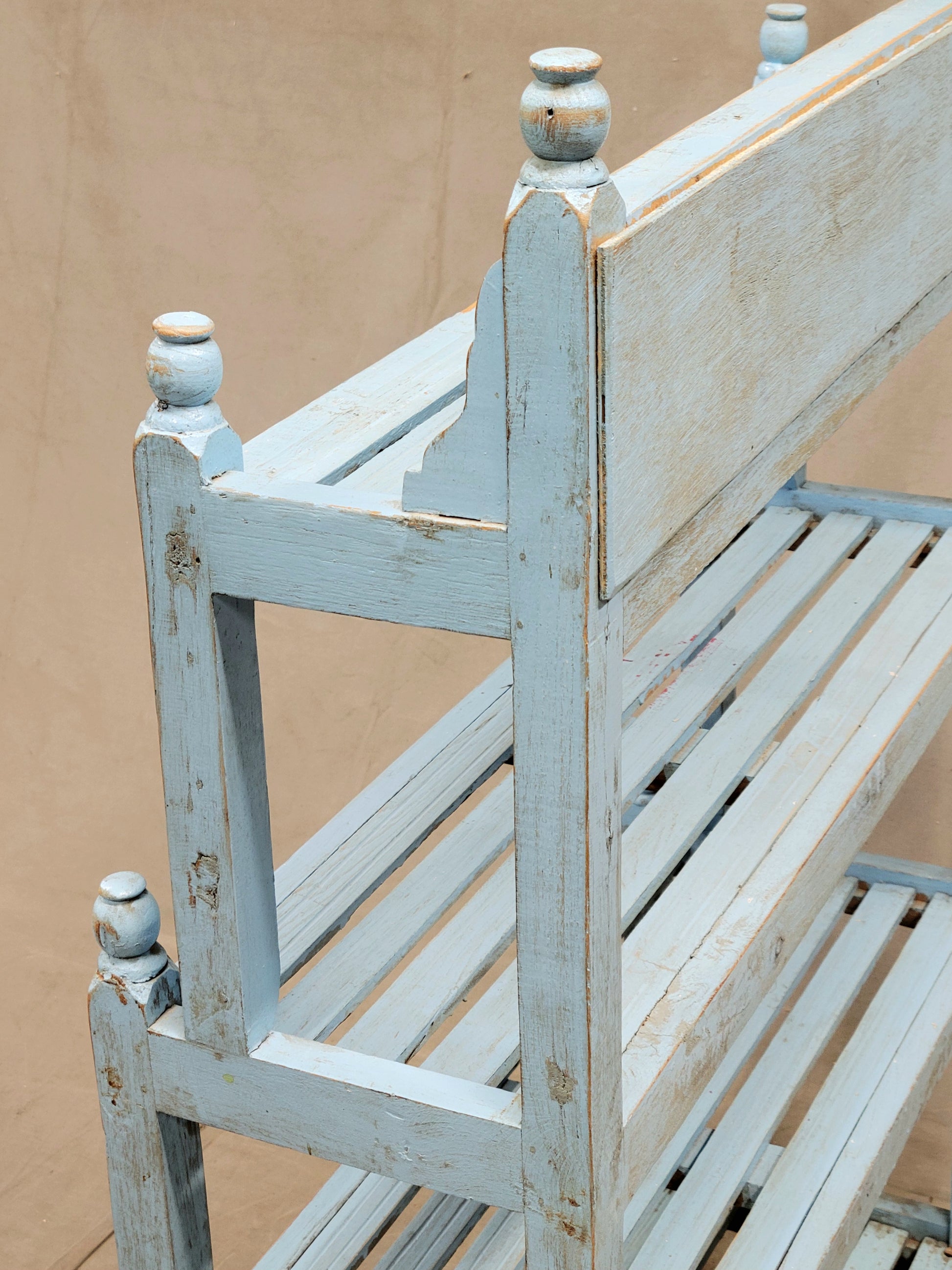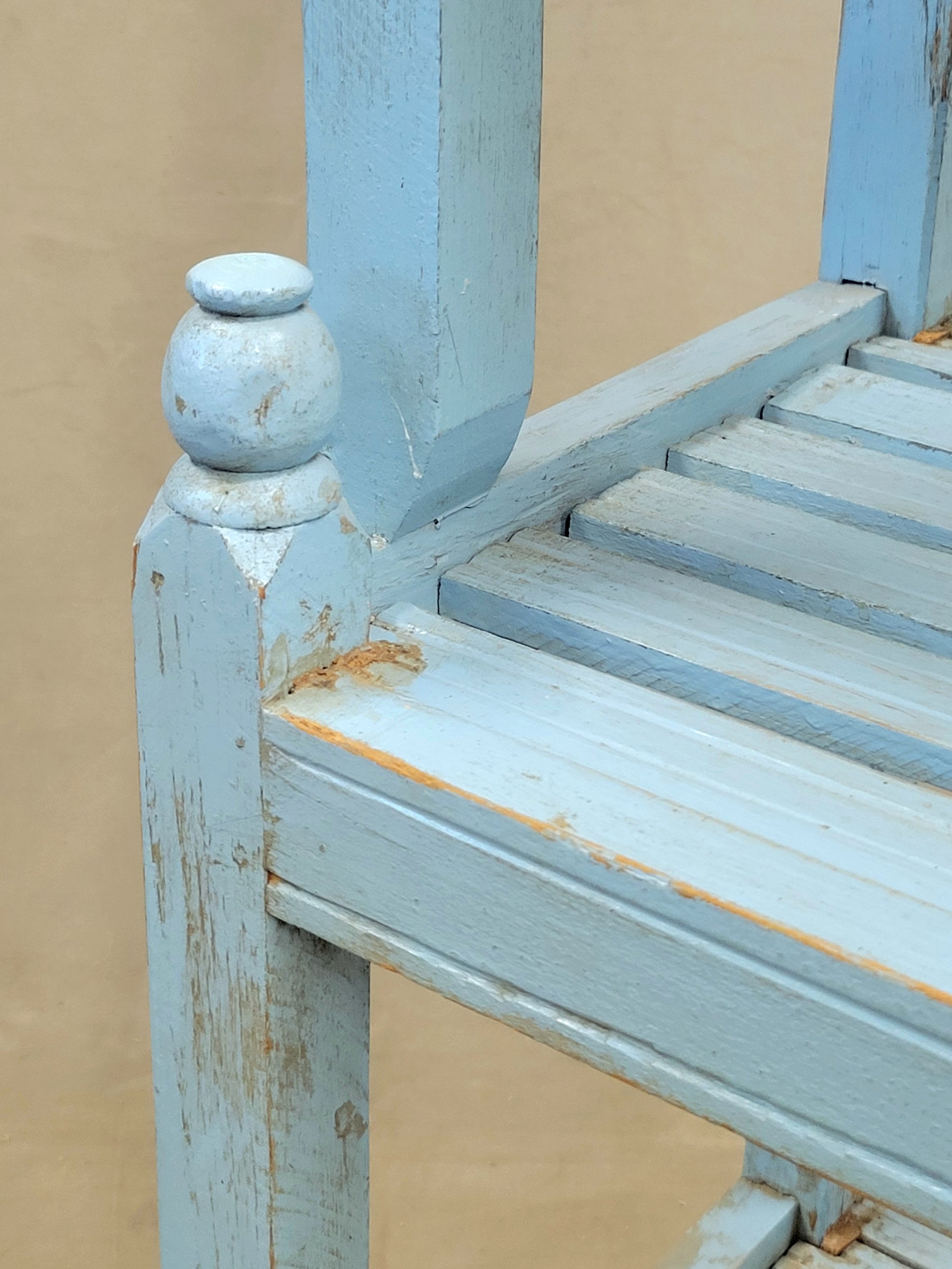 A charming and functional vintage Indian bookcase is so decorative! Painted a beautiful sky blue and ornamented at the top with pink floral tile this piece would offer a fun element to almost any space. The four slatted shelves offer storage for almost anything... books, curios, plants, or bathroom storage with towels and bath salts! Note the turned finials at the corners which add to the charm.